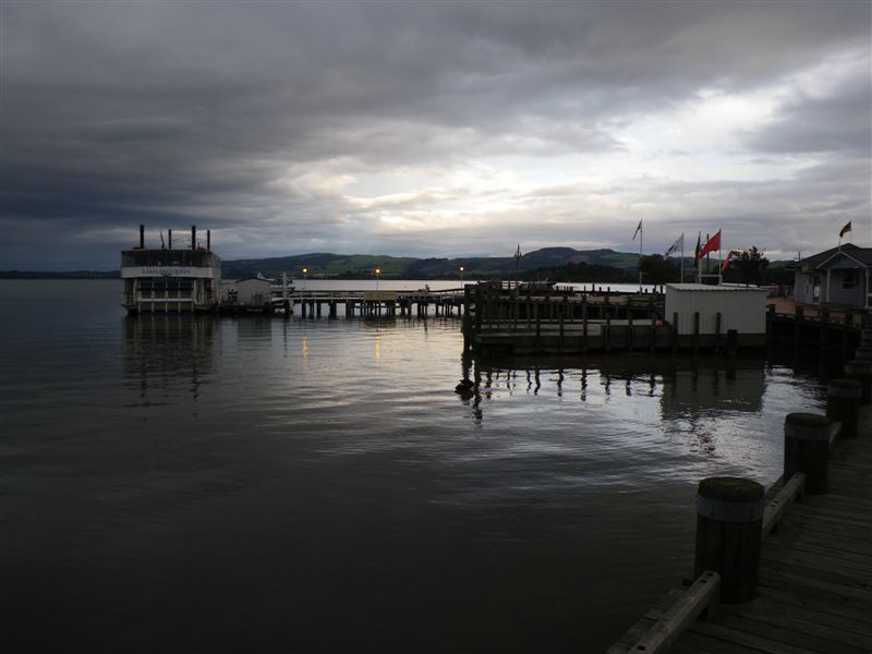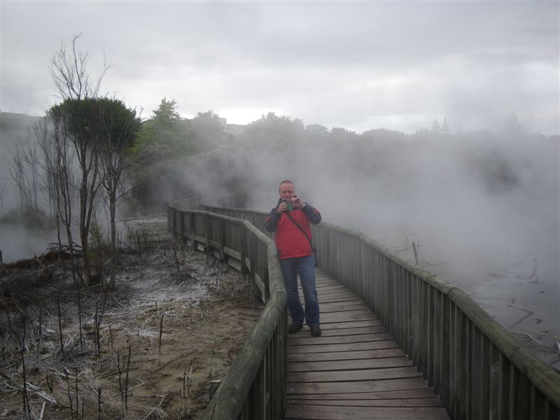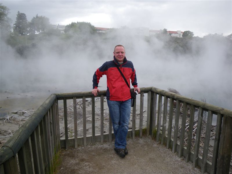 Rano jsme natesene brzo vstavali na dalsi pout. Kdyz jsme vyjeli, pocasi nebylo motorkarsky nakloneno, stale jemne poprchavalo a tak doslo na vyhrivane rukojeti. Cekala nas prvni delsi trasa, ktera merila necelych 300km. Po par hodinach jizdy se do nasich nosnich direk dostava vune zkazenych vajec, neklamny to znak bliziciho se mesta Rotorua. Nase pokoje v hotelu Ibis jeste nebyli pripraveny tak jsme se zajeli podivat kde jsou mistni atrakce typu Hells Gate. Po hodince jsme se vratili zpet do hotelu, kde uz jsme se mohli ubytovat. Nejenom jizdou na motorce a kochanim ziv je clovek a vydali jsme se hledat jidlu mista zaslibena a to restaurace. Vybrali jsme Stonegril, kde byla podle nas nejsympatictejsi obsluha. Po objednani jehneciho masa nam donesli zhavy kamen a flakotu syroveho masa, po uvodni instruktazi jsme si zacali roznit sami. Jak jednoduse propecenost masa prehodit na hosta. Nicmene jehneci s nejakou zahadnou zeleneamarounovou omackou bylo vynikajici. Jeste byl nejaky cas a sli jsme se projit do mestskeho parku, kde jsme se setkali tvari v tvar mocne prirode. Bylo tam nekolik jezirek, ze kterych unikala para. V podvecernim seru cela scena vypadala demonicky a ve vzduchu vsude pritomna sira. Misto bylo idealni ke vlozeni druhe boty ze serie nasich ctyr travel bugu. Prvni byla umistena na plazi Cathedral Cove, cimz jsme splnili zavazek dvou botek na severnim ostrove. Cestou zpet jsme se stavili v utulne hospudce a slo se na kute.