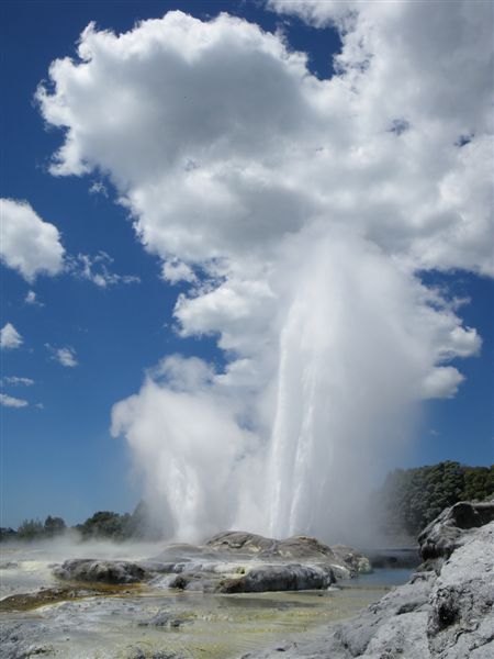 A tak jsme navstivili druhou cast, ktera byla narozdil od Whakarewarewa rozsahlejsi a velmi pekne udrzovana. Hlavnim lakadlem byl nejvetsi gejzir NZ Pohutu (coz znamena „cakanec“), ktery tryska do vyse 15-20 metru trikrat do hodiny. Kdyz jsme k Pohutu prisli, tak poprskaval max do metru a tak jsme si chvili postali a slibovany vykon se dostavil. Ohromujici.