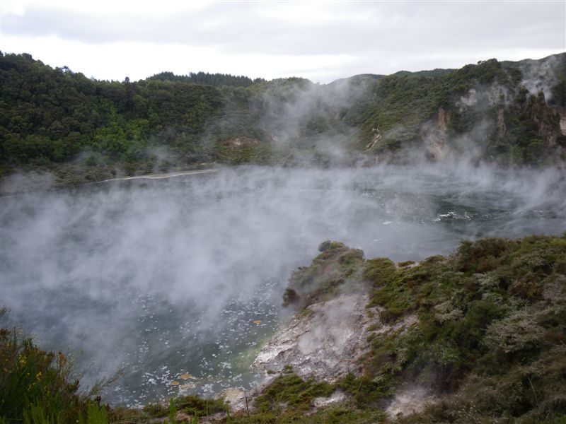 Zpet do udoli, cela trasa byla cca. 4 km a dobre schudna, tak ze jsme se neprevlekali a v motorkarskem vyrazili na turu. Bylo nam jasne, ze to bude na stejne tema jako predchozi setkani se sirou, ale po kratkem pochodu se pred nami otevrelo pomerne velke udoli, kteremu dominovalo jezero v krateru o prumeru 100 metru, ze ktereho, jak jinak, stoupala para, uz proto ze se jedna o nejvetsi horky pramen na svete. V kontrastu s okolni klidnou, zelenou prirodou vypadalo jezero jak z jine planety, opet ohromujici. A dalsi a dalsi varici tunky, ricky a jezirka nasledovala, to vse ve velmi podmanive prirode. Na konci udoli jsme dosli k jezeru, kde trasa koncila a odkud nas zpet na zacatek odvezl autobus po ceste velmi podobne te z Jurskeho parku.