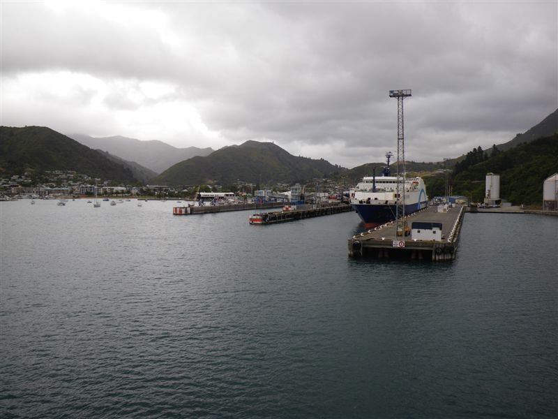Trajekt dorazil do malinke zatoky u mesta Picton, kde krome ctyr terminalu pro trajekty nebylo v podstate vubec nic. Kapitan trajekt bravurne otocil a nacouval s neuveritelnou presnosti do terminalu s nejvyssim pripojnym bodem, mostem mezi horni palubou, kde byli nase motorky a silnici. Jak u kazdeho pristani, at uz letadla nebo lode vsichni pasazeri az na dva propukli v silenstvi ve znameni opusteni dopravniho prostredku ihned a za kazdou cenu. Tak ze jsme z lode vyjizdeli skoro posledni, v klidku, vzdyt mame dovolenou, neni kam spechat.