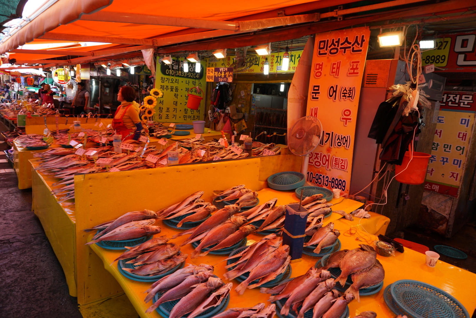 Dále mé kroky vedou do Jagalchi, kde se nachází obrovské tržiště ryb. A nejenom ryb, vše co hrdlo ráčí a plave v moři. Rejnoci, úhoři, mušle, kraby, chobotnice, olihně…….. Několik ulic stánků včetně vývařoven a to tam je ještě celá hala prodejců.