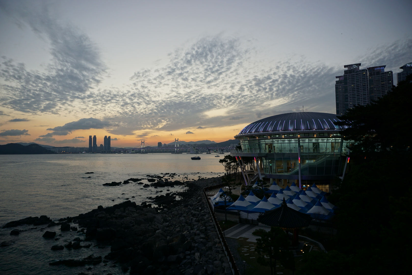 K ubytování je to asi 45 minut s jedním přestupem. To nalézám díky GPS jednoduše. Pokoj mě příjemně překvapil. Masážní vana a pod záchodovým prkénkem je elektronicky řízený bidet. Už se sice stmívá, ale je to kousek k moři, tak proč se ještě nepodívat. A jak jdu kolem pláže, tak uvidím Busan sea aquarium. O programu je rozhodnuto. Platím vstupné a sjíždím dolů do patra na začátek prohlídky. Oproti jiným akváriím zde mají tučňáky. Jinak zde můžete vidět různé ryby, korály, žraloky, chobotnice a spoustu dalšího v několika patrech. Nechybí ani tunel. Výhodou vstupu před zavíračkou je v tom, že je zde málo lidí a tak si prohlídku skutečně užívám.