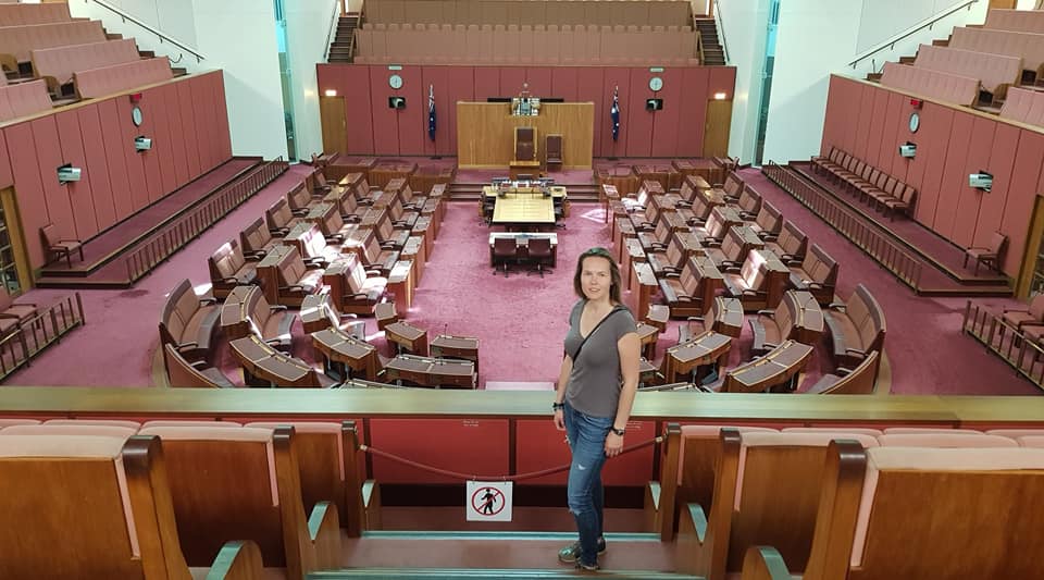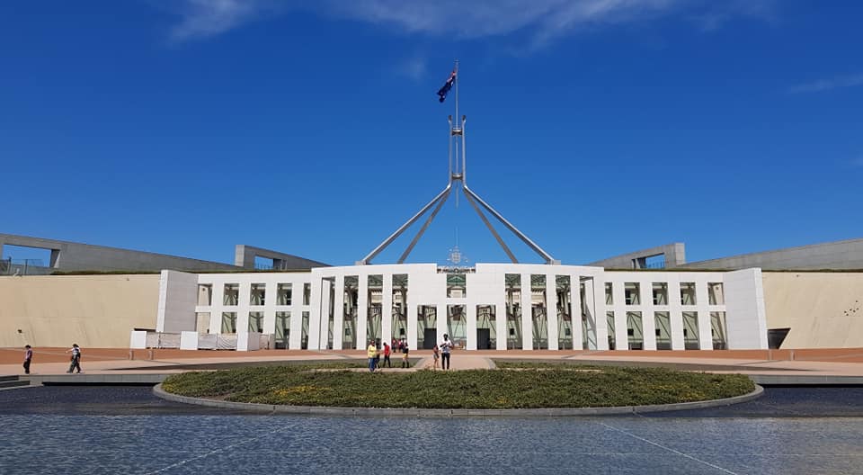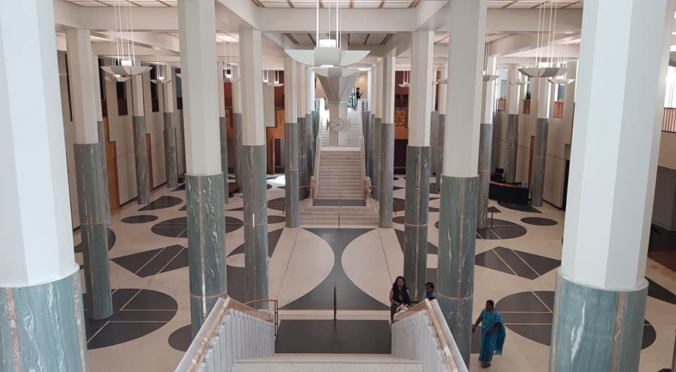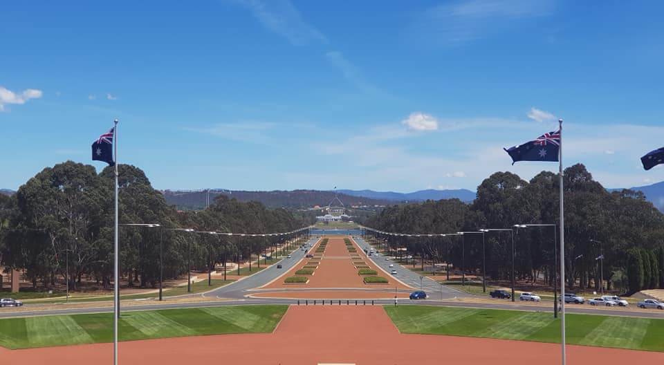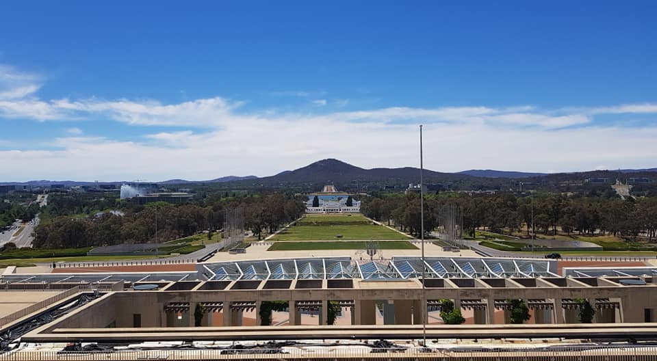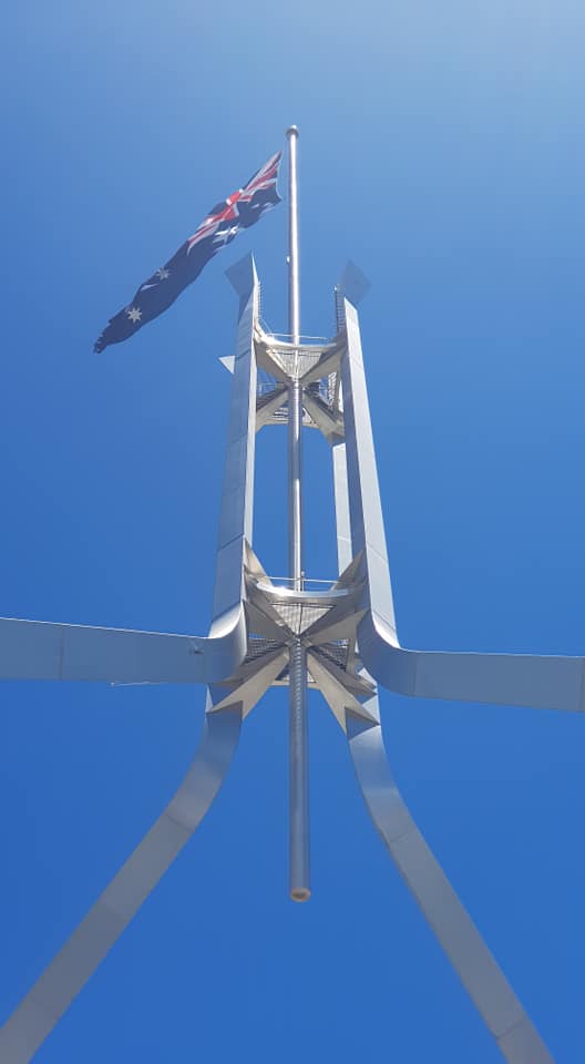 Jyndabyne jsme opustili trochu později a tím pádem dorazili do Deep Space Communication Complexu o půl hodiny později, než bylo plánem. Navíc zdejší kiosek nabízející občerstvení byl dočasně zavřený, tak že jsme přišli i o plánovanou snídani. To nám ale nezkazilo zážitek především z hlavního radaru Deep Space 43 o průměru 70 metrů a z malé, ale autentické úžasné expozice o dobývání vesmíru. A navrch kousek měsíce, dovezený samotným Amstrongem a Aldrinem, a nesmíme zapomenout ani na Collinse, který sice na měsíci nestál, ale bez něho by se mise nikdy neuskutečnila. Opět jsme přenastavili spoustu jedniček a nul na paměťových kartách a vyrazili do Canberry, přímo do Parlamentu. Zaparkovali zdarma v podzemních garážích a po nezbytné kontrole, zda neneseme do parlamentu bombu, jsme se ocitli v nádherné vstupní hale, která má připomínat eukalyptový les. Doleva po schodech nahoru a pak zase doleva, jak si někteří pamatují, a už jsme snídali a pili kávu. Konečně posilněni jsme vyrazili na obhlídku parlamentu, postupně navštívili hlavní sál, jednací sál poslanců, jednací sál senátorů, zkoukli spoustu obrazů a jako třešničku vyjeli výtahem na střechu, kde jsme obdivovali výhled a obrovskou australskou vlajku na mohutném stožáru.