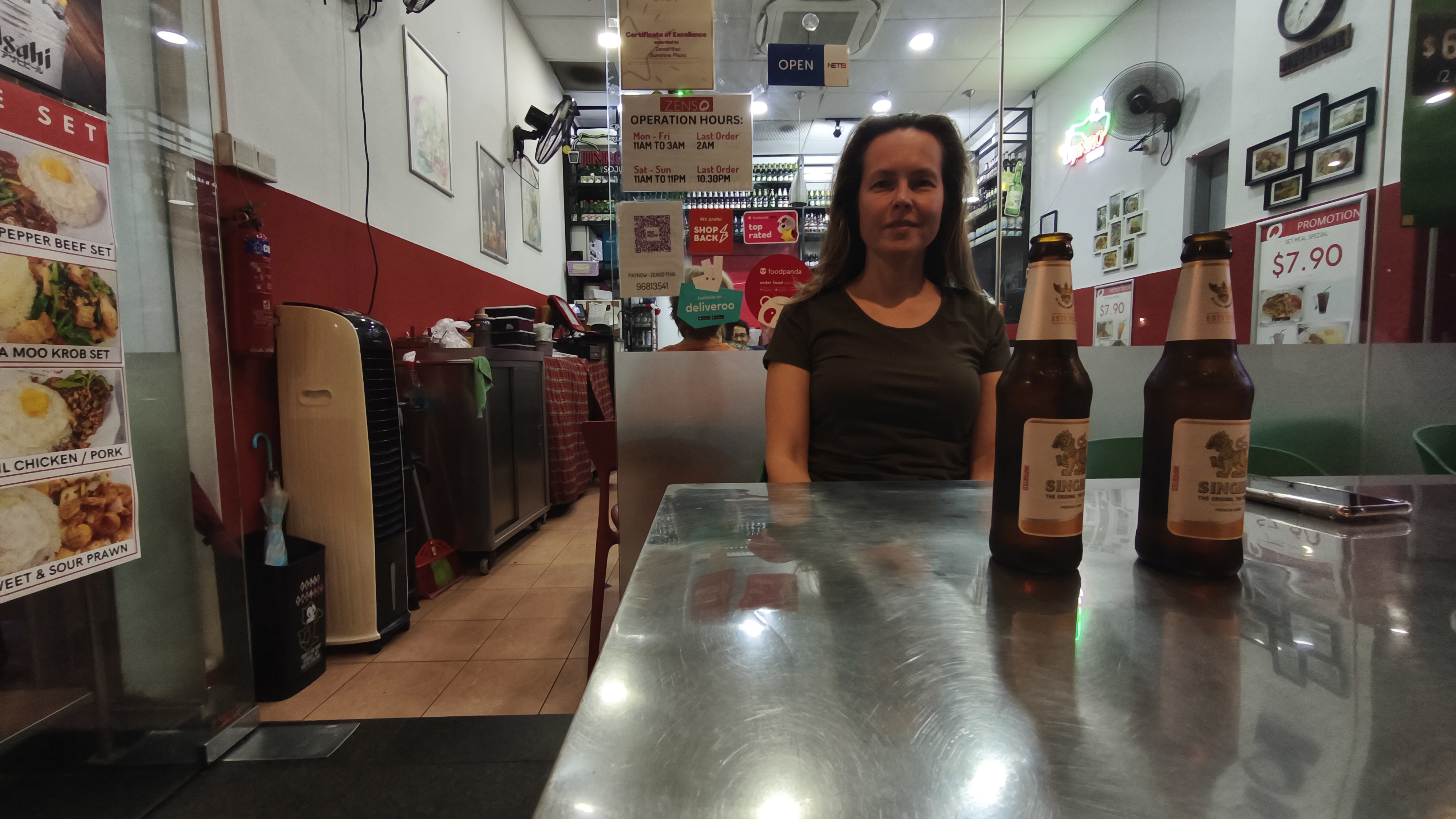 Půl hodiny před šestou se nám nechtě povede předběhnout frontu u odbavení a cpeme se do letadla. Sedíme na prostřední čtyřce sedadel, hned za sekcí pro bohaté, Maki na pravém kraji, já vedle ní, a tak mám souseda. Tedy vlastně sousedku, asi tříletou holčičku, která se pak po celý čas letu roztahuje a strká mi svoje nožky do všech možných míst. Vzhledem k tomu, že jsem toto už v minulosti zažil, je mi to jedno, hlavně, že neřve. Po startu nám dávají něco jako večeři a pak nás nechají spát, aby po 12 hodinách letu rozdali něco jako snídani. Z našeho časového pohledu je snídaně OK, ale hodinu na to nás letadlo vyplivne v Singapuru, kde jsou čtyři hodiny odpoledne. Co jsme proboha dělali těch třináct hodin letu? Tak povětšinou dřímali až spali, letadlo Airbus A380 je sice vybaveno audiovizuálním zábavným systémem, ale ovladače jsou povětšinou rozbité a sluchátka se k němu již nevydávají, a k tomu ne všechny filmy mají titulky, aby je bylo možné sledovat bez zvuku. British Airways…