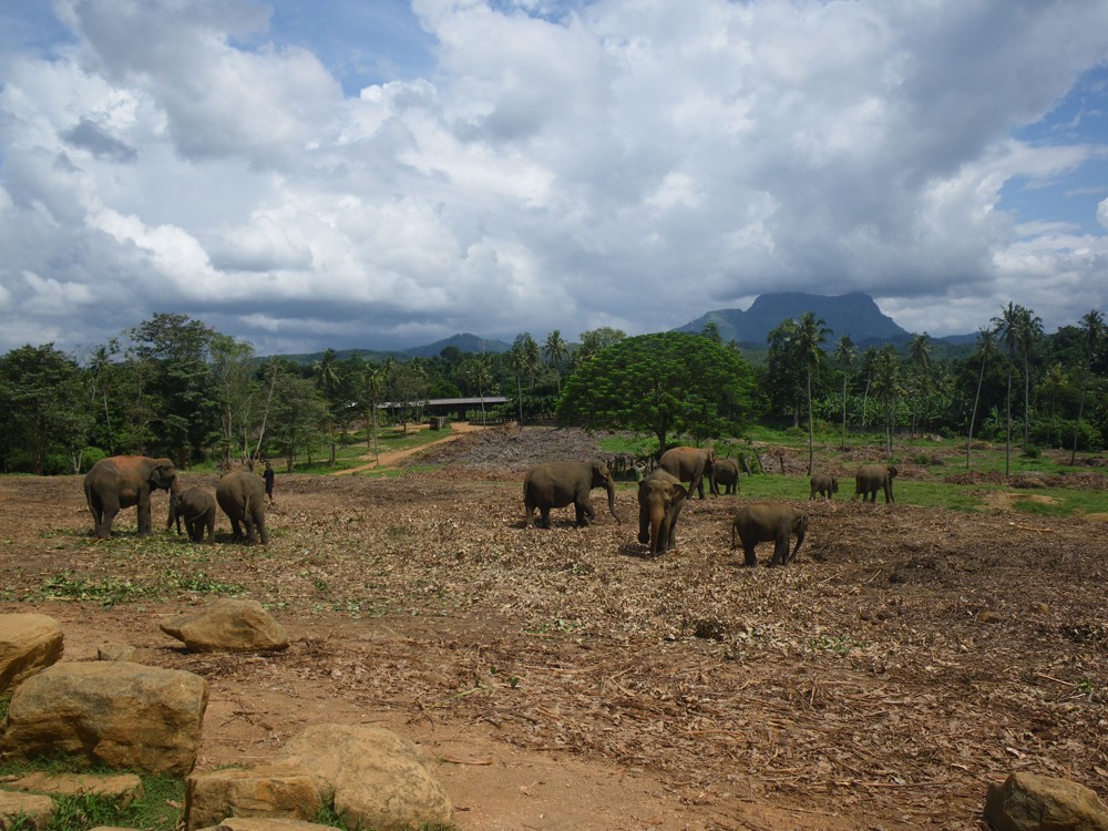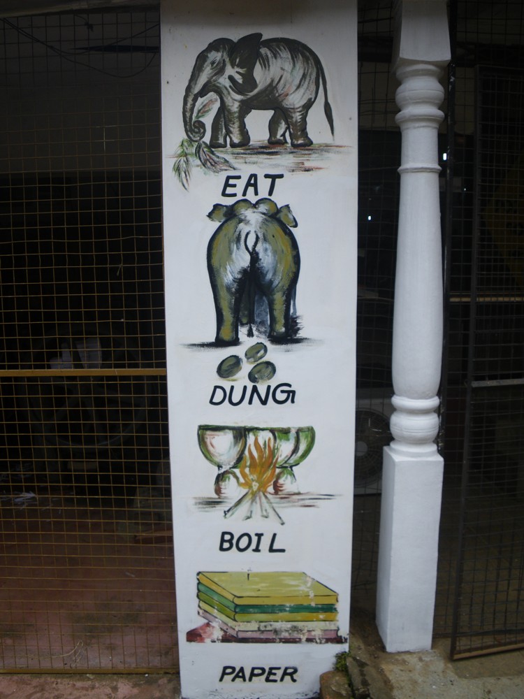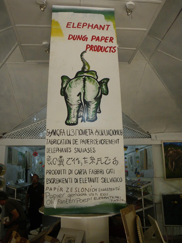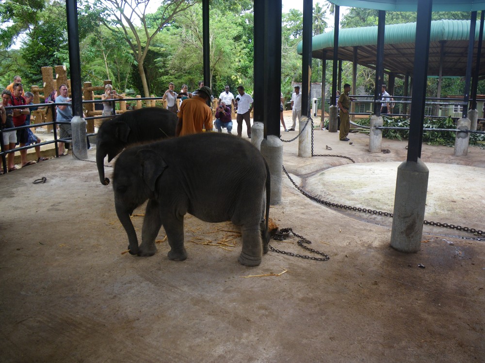 V pravé poledne byla další atrakce a to vyhnání slonů z řeky, prohnání městem a zavření do výběhu. Karty se opět plní bity. Teď máme ještě přes hodinu čas, než začnou krmit slůňata. Přecházíme od řeky do sirotčince a cestou nás místní naháněč poslal do manufaktury, kde vyrábí ze sloních exkrementů (takto česky to bylo napsáno na zdi) papír. Místní průvodkyně nám popisuje postup této výroby, kde je na konci 100% přírodní papír. Je dokonce i v různých barevných variacích. My dále pokračujeme na slony. Procházíme celým areálem, mají tam krásný výběh pro dospělé, malý pro slůňata a ošetřovnu, kde právě léčí nějakého slona. Ve čtvrt na dvě začíná další šou. Krmení mláďat mlékem z velkých lahví s dudlíkem. Opět několik autobusů se nahrnulo na jedno místo. Zřízenci přivádí dvě mláďata, kterým přivazují na nohy řetězy, které jsou spojeny s okem v betonové zemi. Někteří lidé se prodírají ku předu s lístkem v ruce, kterým nad hlavou zuřivě gestikulují. Jak jsme pochopili, koupili si lístek, že se můžou vyfotit jak napájí slona. Po této atrakcí se opět vracíme k autu a pokračujeme dále k našemu ubytování, které je v Anuradhapura.