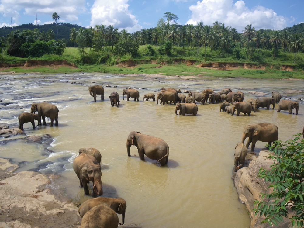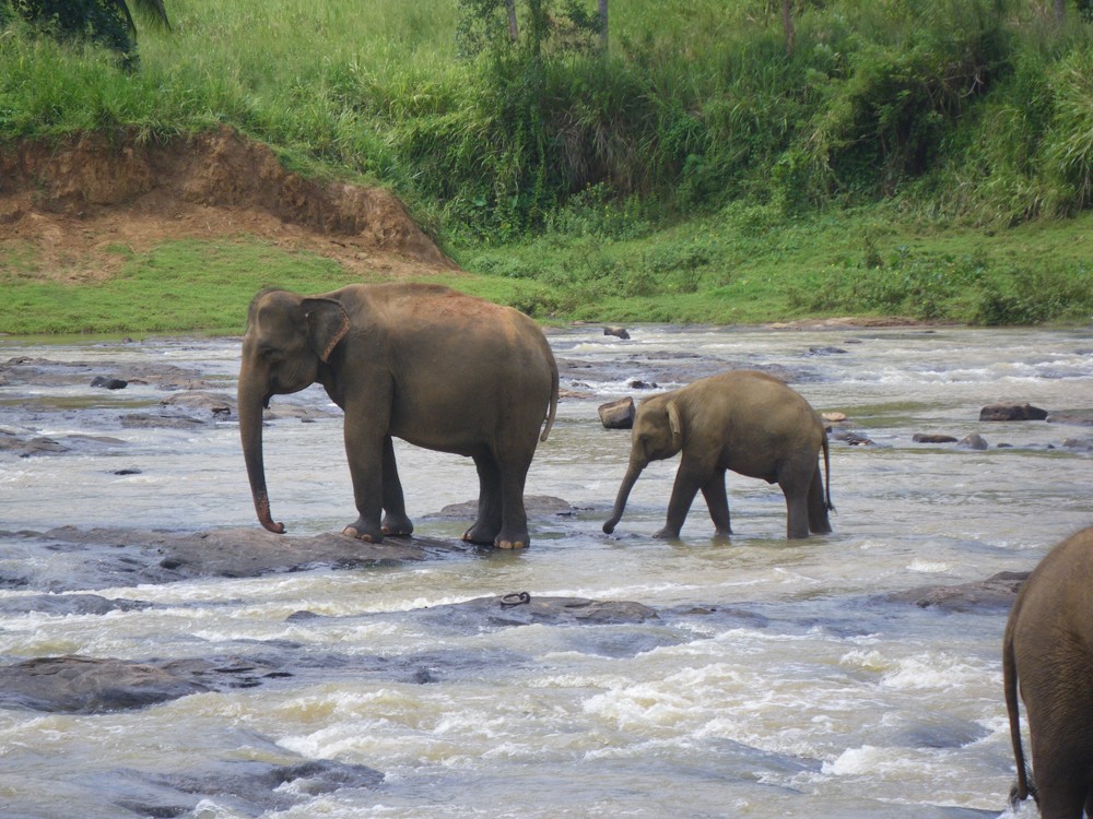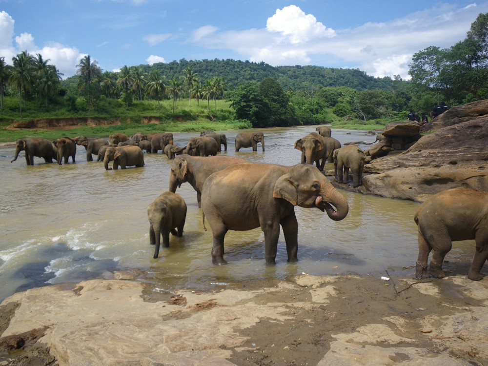 Dvě a půl hodiny a zastavujeme. Před námi je sloní sirotčinec. Kupujeme lístky každý za 2.500 rupií, což se dělí 6.50 na koruny. Podle Hanky se z toho stala velice komerční záležitost, což se i potvrdilo. Prvně se vydáváme k řece, kde je koupání slonů. Početné stádo dospělých a slůňat se pěkně rochnilo ve vodě. Sestoupili jsme až ke břehu s davem dalších lidí, kde jsme je pozorovali a fotili. Vedle řeky je terasa s výhledem, kde jsme se za pár minut pěkně uvelebili do sedaček, objednali Coca Colu a šrumec v řece jsme pěkně pozorovali z výšky.