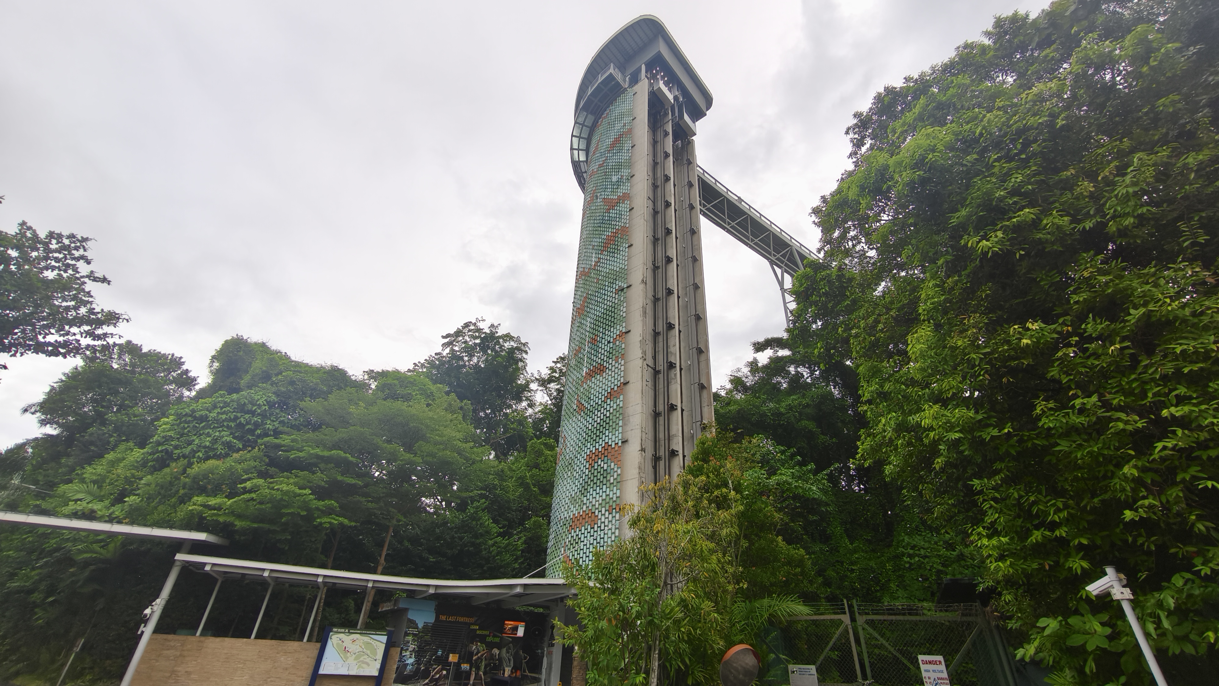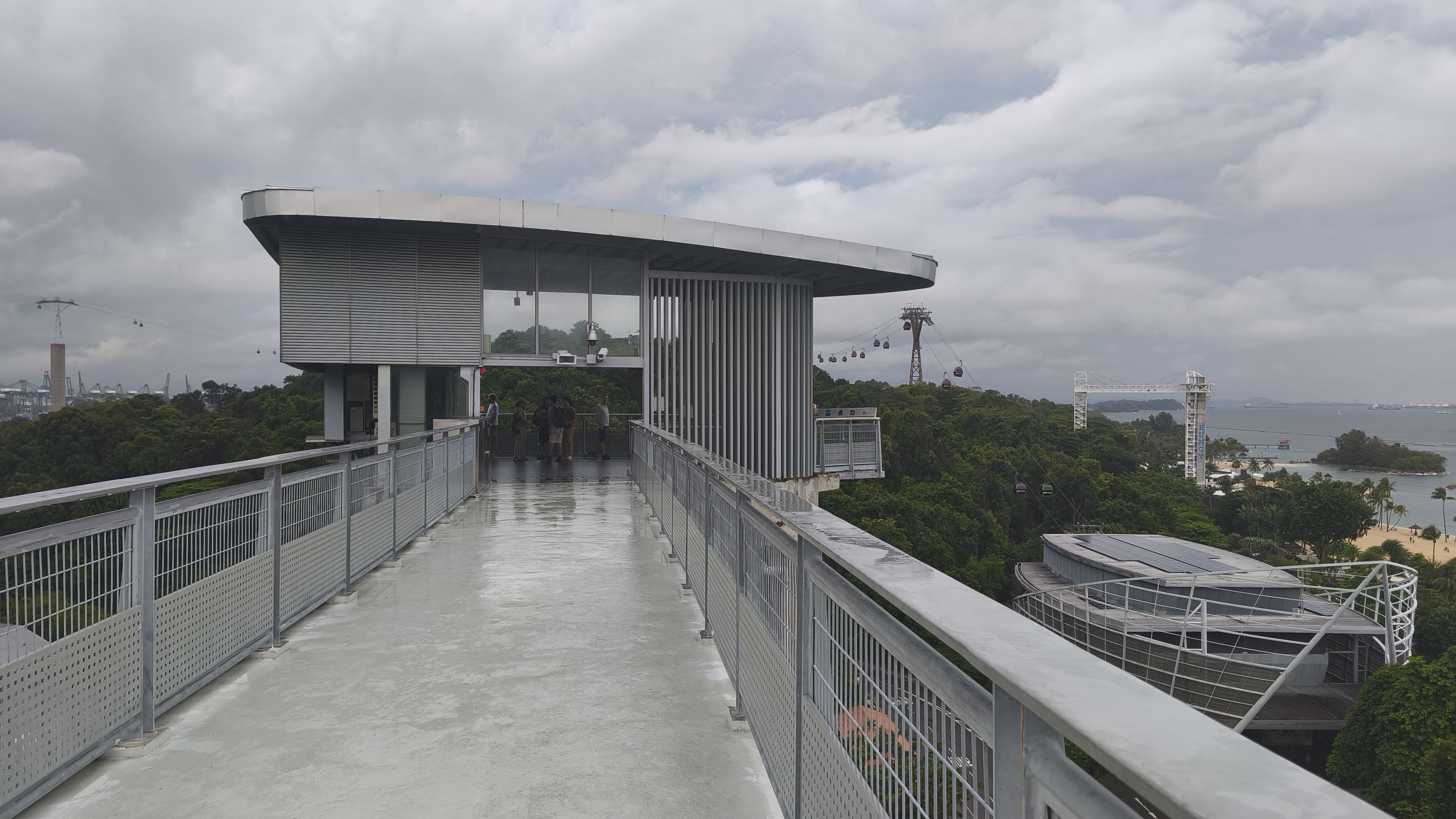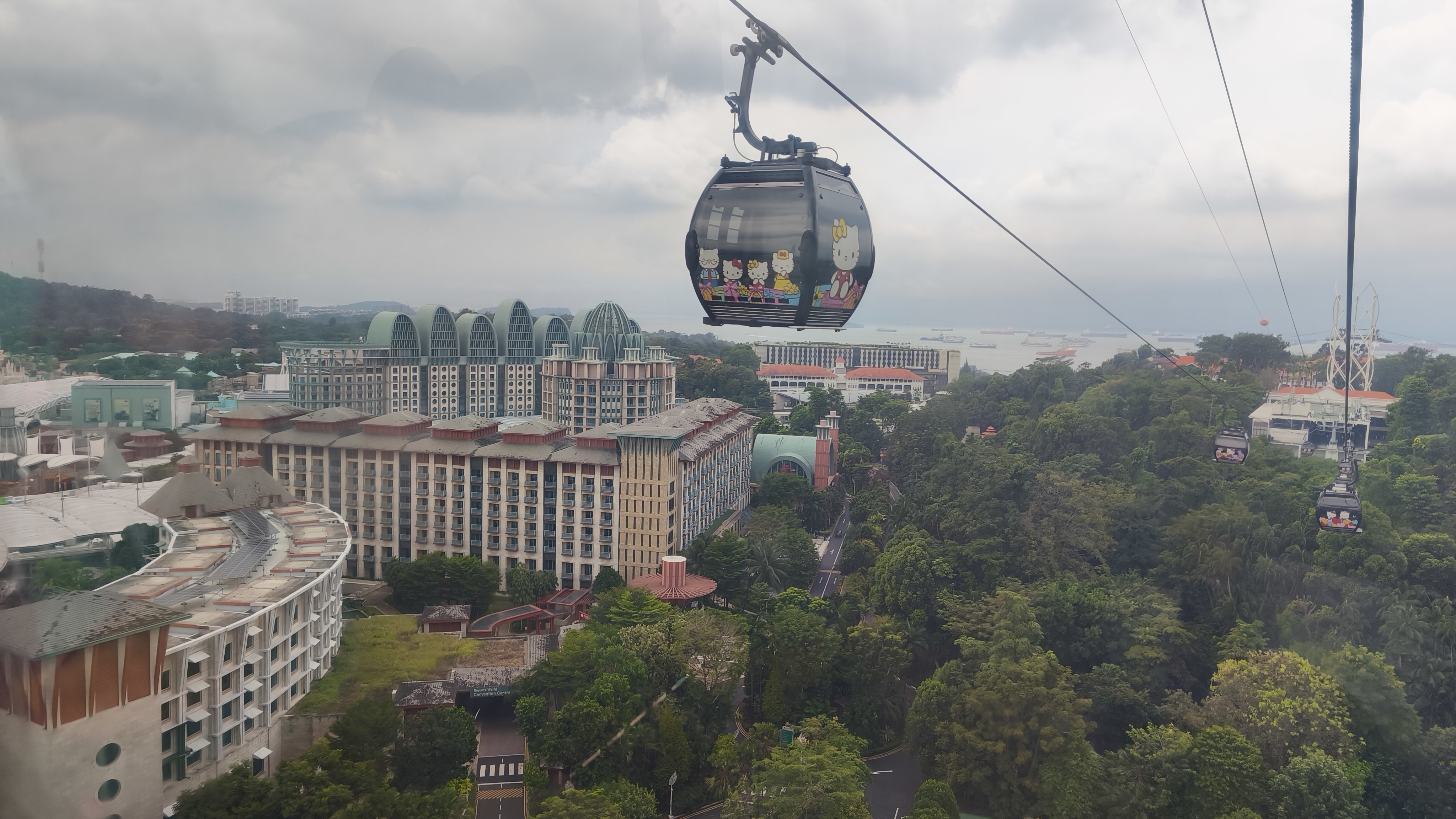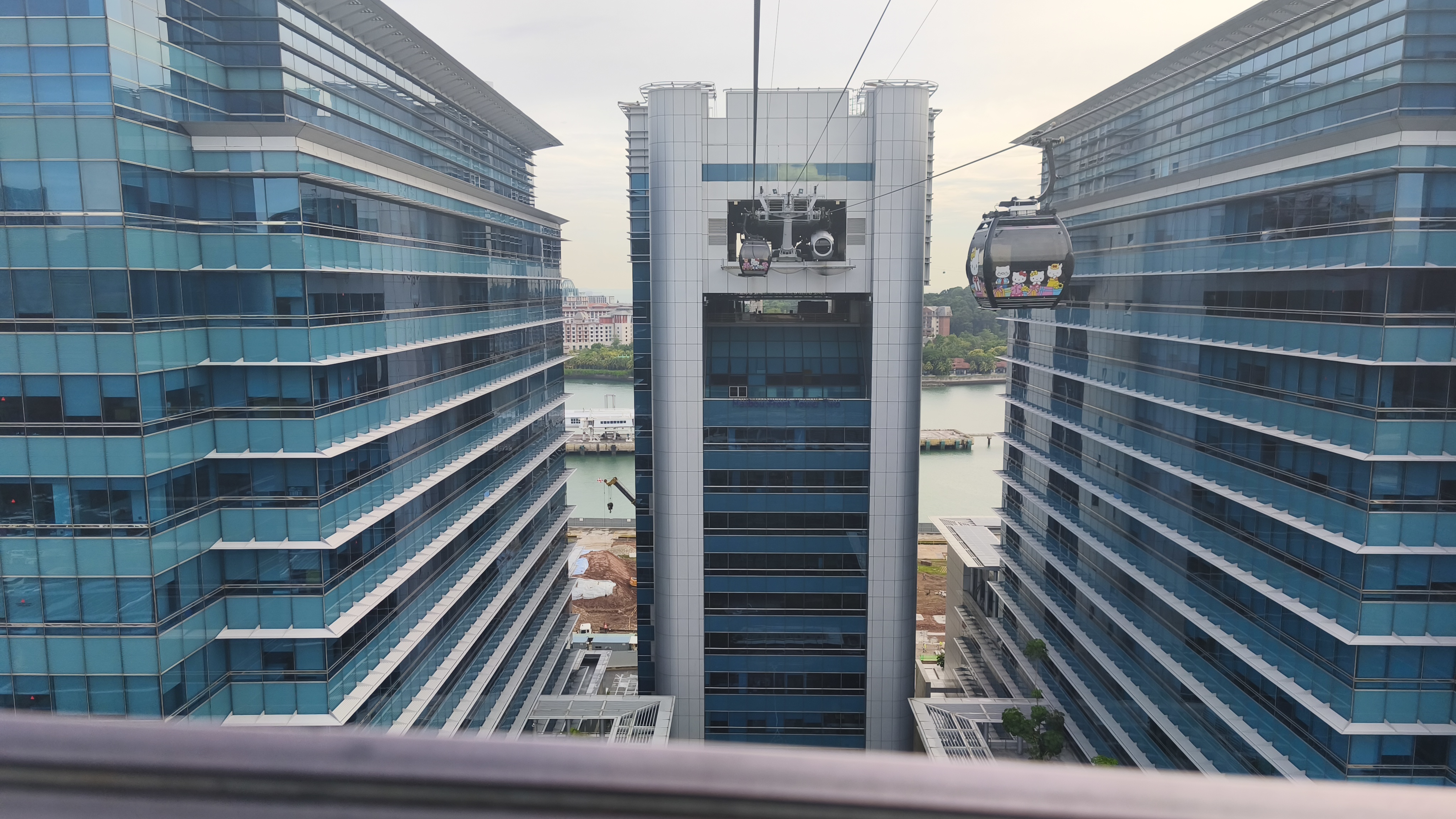Ze stanice metra se necháme vést ukazateli, které se zdánlivě ztrácí a zase objevují a vedou nás kolem kancelářské budovy Harbourfront Tower II, až se dostaneme ke kasám, kde zaplatíme denní jízdenku na všechny trasy a přesuneme se k výtahu v budově. Ten nás vyveze do patnáctého patra, kde je ve výšce 69 metrů uvnitř budovy jedna ze stanic lanovky. Bez fronty naskakujeme do nejbližší osmimístné kabinky, kde nám společnost dělají dva angličtí turisté a fičíme přes Singapurský záliv, tedy de facto přes Indický oceán přes nejvyšší (druhou) věž lanovky ve výšce 88 metrů.