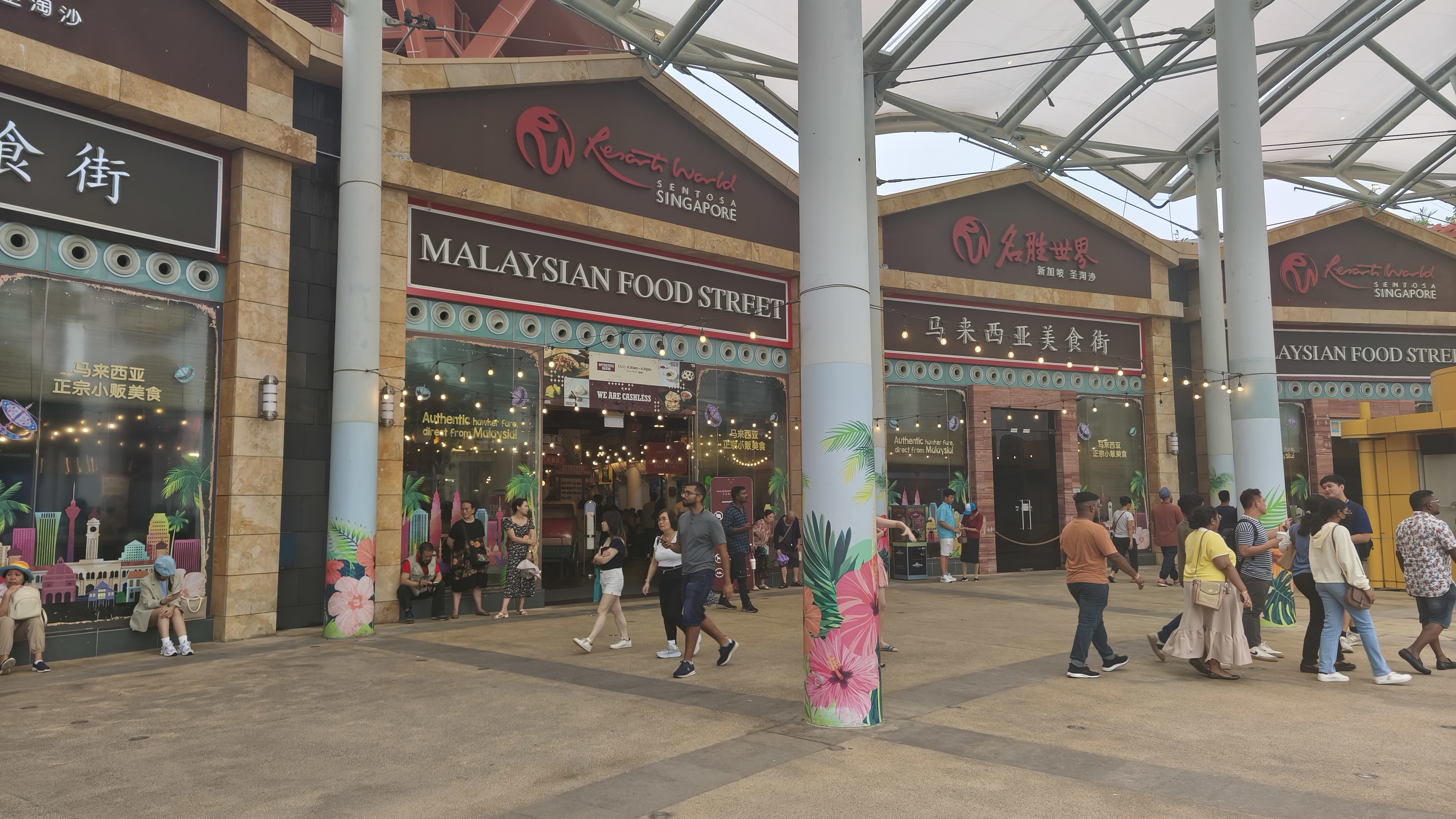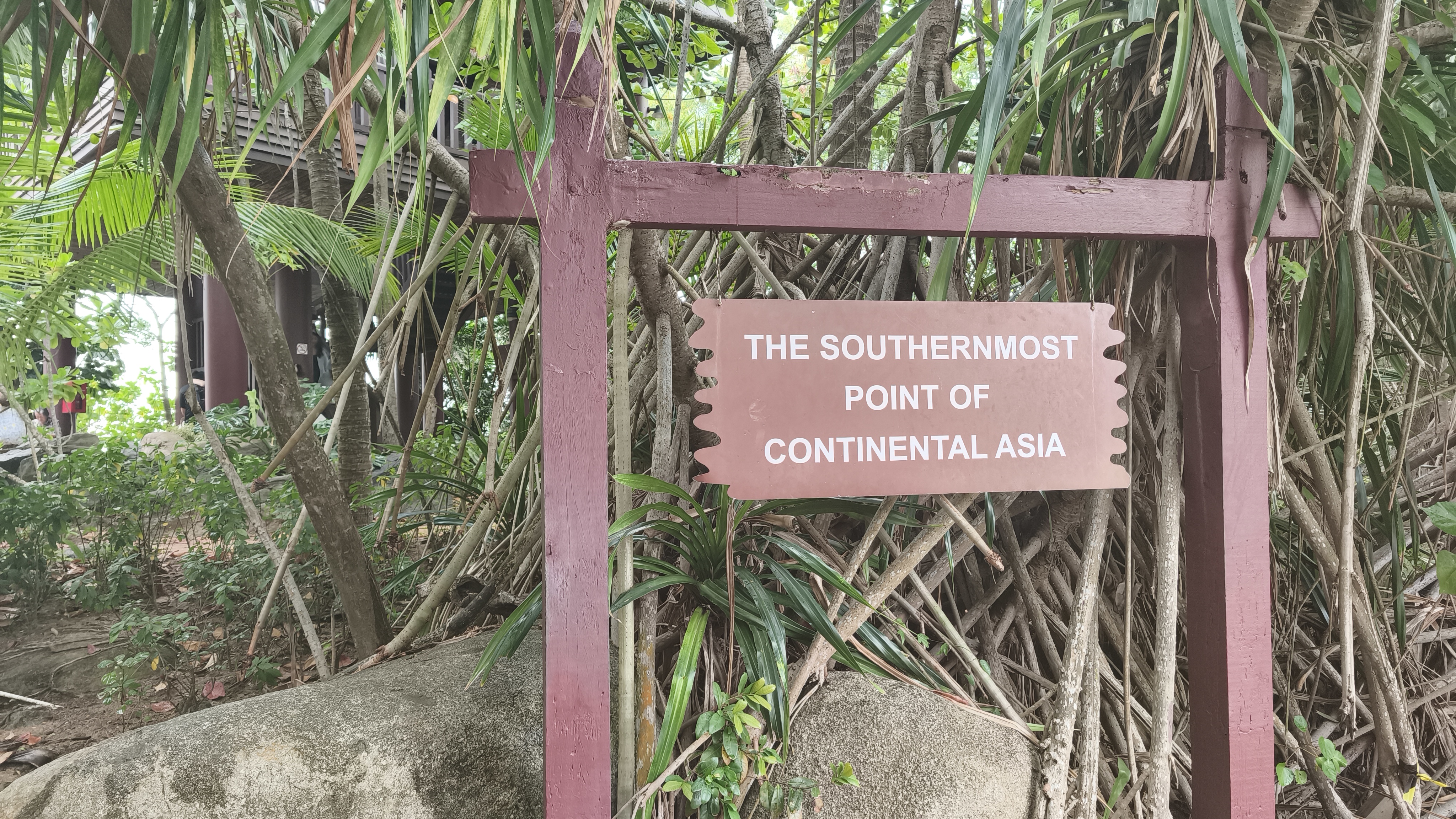 Tak horké to není, protože lanovka na ostrově funguje dále a tak se vracíme přes stanici Imbiah Lookout a pokračujeme dále do stanice Merlion, kde vystupujeme a míříme k vchodu do Universal Studios. To jen proto, že sousedí s food courtem. Singapur býval kdysi Malajsie, tak že malajská kuchyně je v podstatě singapurská a opačně. Co nás zaujalo byl systém objednání. Představte si asi tak 20 různých stánků, u kterých si ale neobjednáte, na to slouží dotykové obrazovky ala Mekáč, kde si prostě naklikáte ze všech nabídek, co vás zaujmou a pak dostanete pípák a čekáte, kdy zazvoní. Vybrali jsme si tři jídla, prostě abychom ochutnali, a nápis na objednávce nás upozornil, že to může trvat 10 až 15 minut. Tak takový čas dokážeme využít, ženeme se ven s vidinou pravidelné dávky nikotinu, když v tu pípák začne dělat kravál a objeví se na něm číslo stánku. Tak tam běžíme a první jídlo máme v podstatě hned. Usadíme se a než si doneseme příbor, už mažu pro další jídlo, a pak hned pro třetí. Pecka, ochutnáváme a snažíme se z objednávky rozklíčovat, co to vlastně jíme. Všechno bylo skvělé, prázdné talíře s podnosy i s utichlým pípákem dáváme do odkládacích vozíků a jdeme se podívat na nejjižnější bod pevninské Asie.