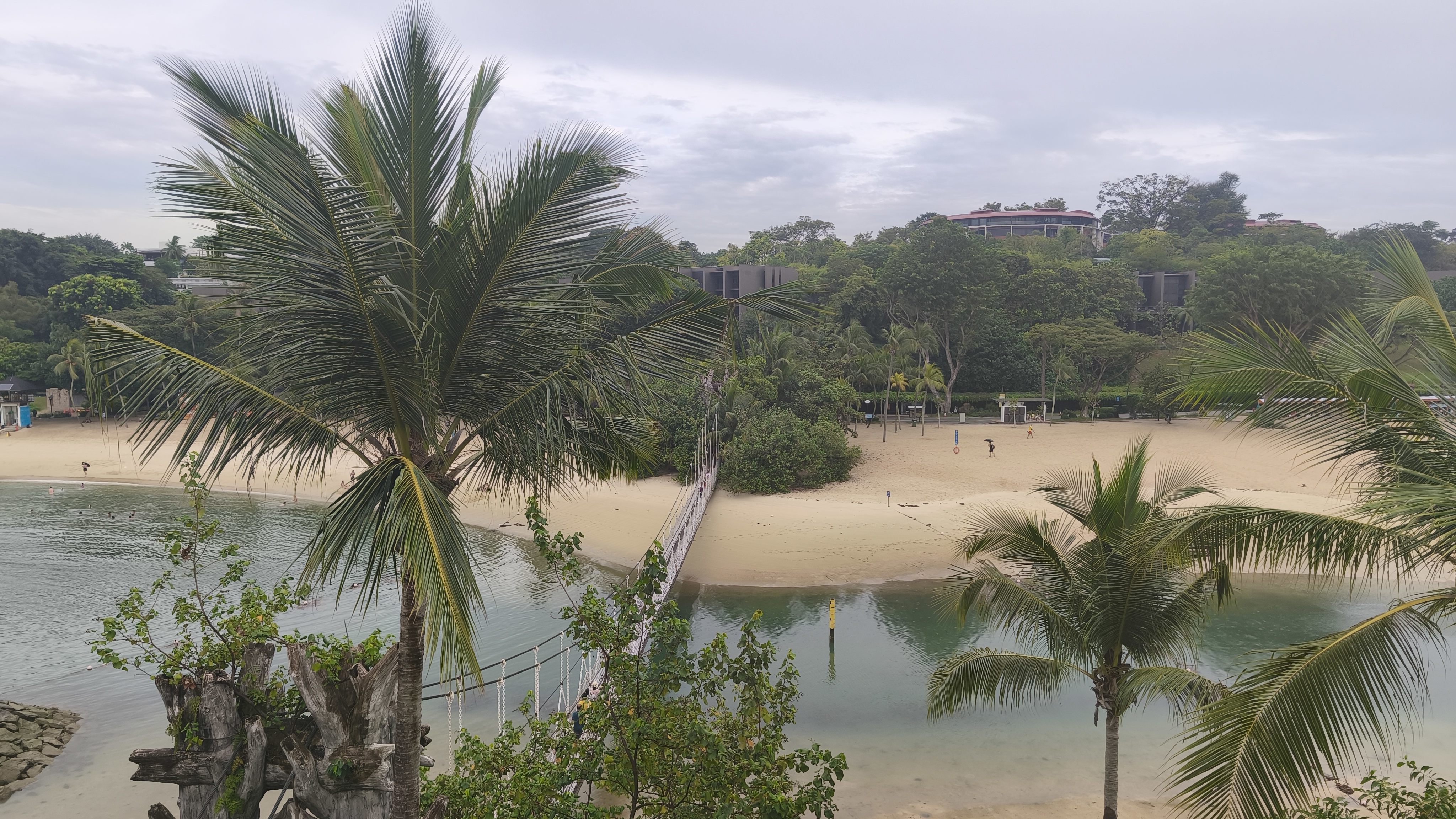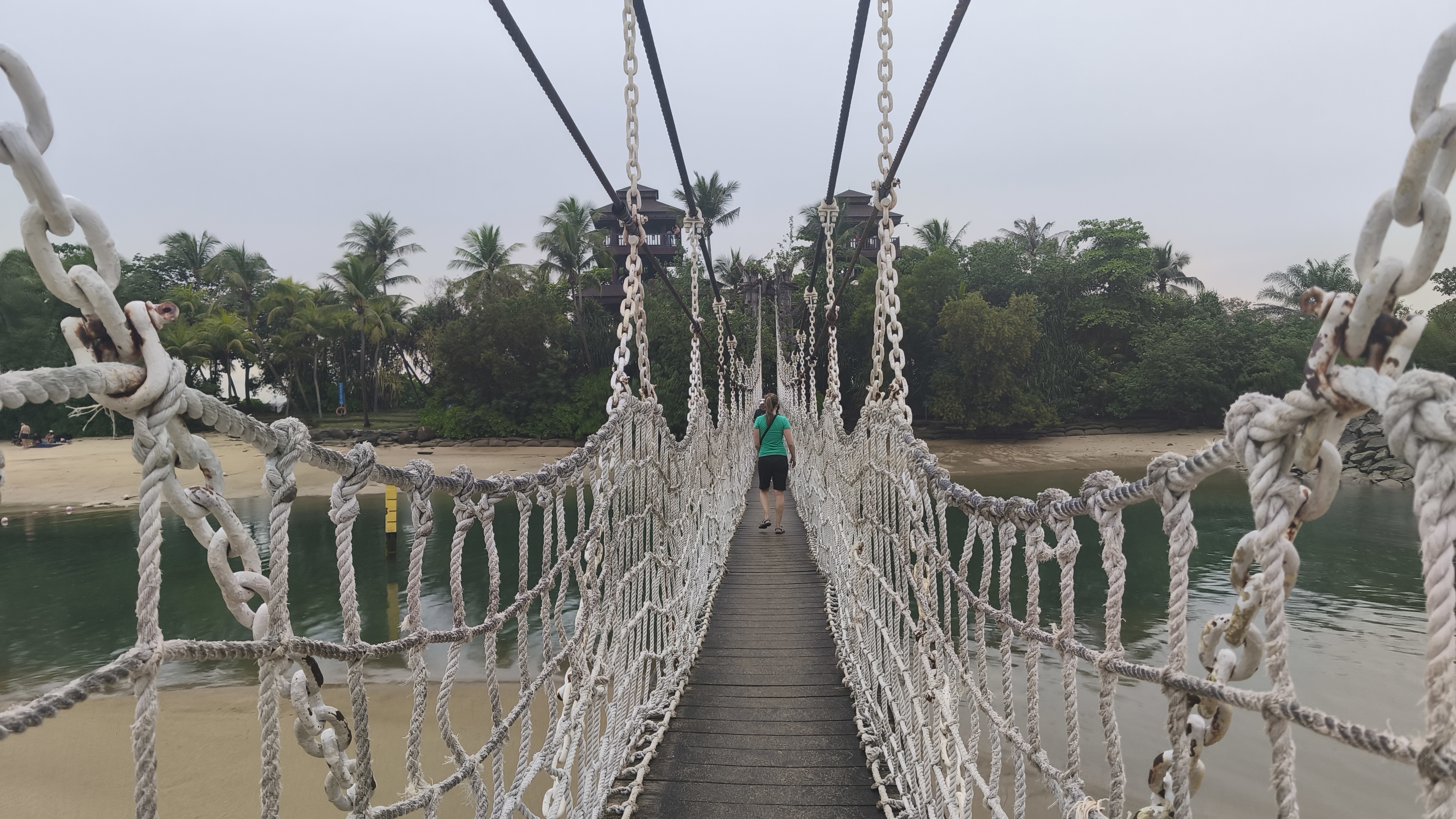 Ačkoliv pořád jemně kape, jdeme stále pod střechou po jižní částí ostrova, a po asi půl hodině docházíme k výběžku ostrova, ze které je lanový most na menší ostrov. Přes lanový most přecházíme trošku obtížněji, protože se na něm musíme vyhýbat lidem, co se vrací zpět, a do toho se pekelně houpe, tak že všichni na mostě provozují chůzi jako ze zombie apokalypsy. Když se konečně dostaneme na malý ostrov (tedy vlastně výběžek pevninské Asie), je tu nemalý počet lidí, kteří okupují dvě dřevěné rozhledny a evidentně si užívají, že tohoto milníku ve svém cestování dosáhli. Jako fakt pitchovina, ale když už tam jste, tak proč to nedat. Po cestě zpět k lanovce už nás nohy moc neposlouchají a tak mastňácky využijeme místní atrakci, monorail, který nás zdarma přiblíží k vytoužené stanici vnitroostrovní lanovky, přes kterou cestujeme do stanice, ze které se dá přestoupit na trasu mimo ostrov.