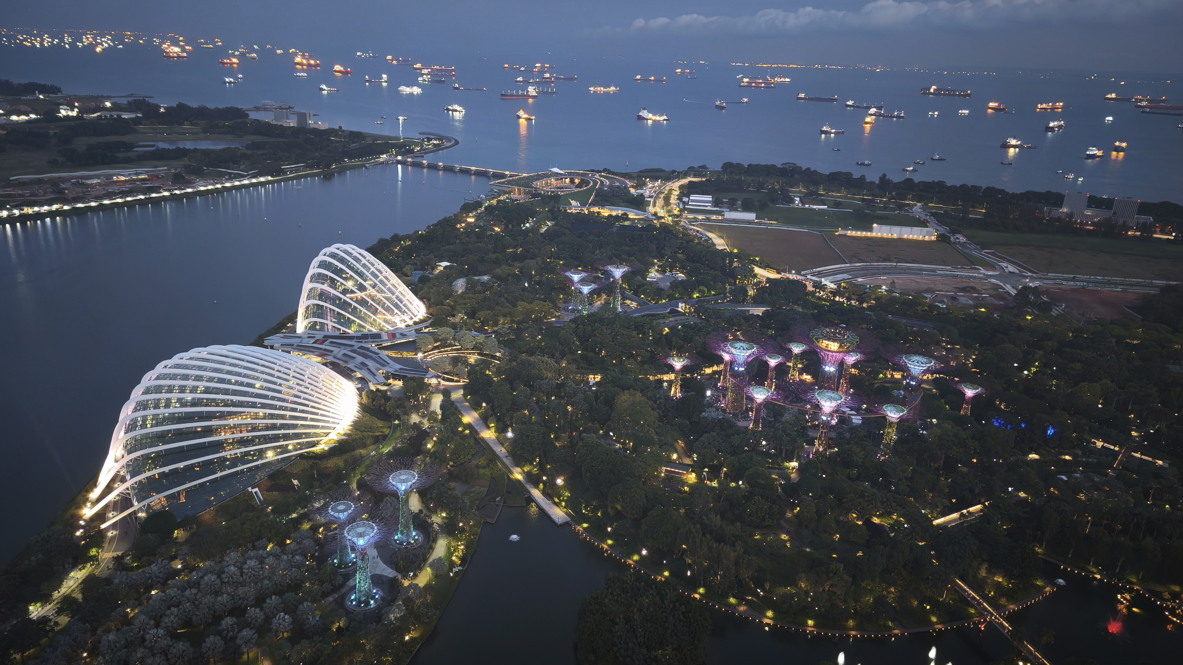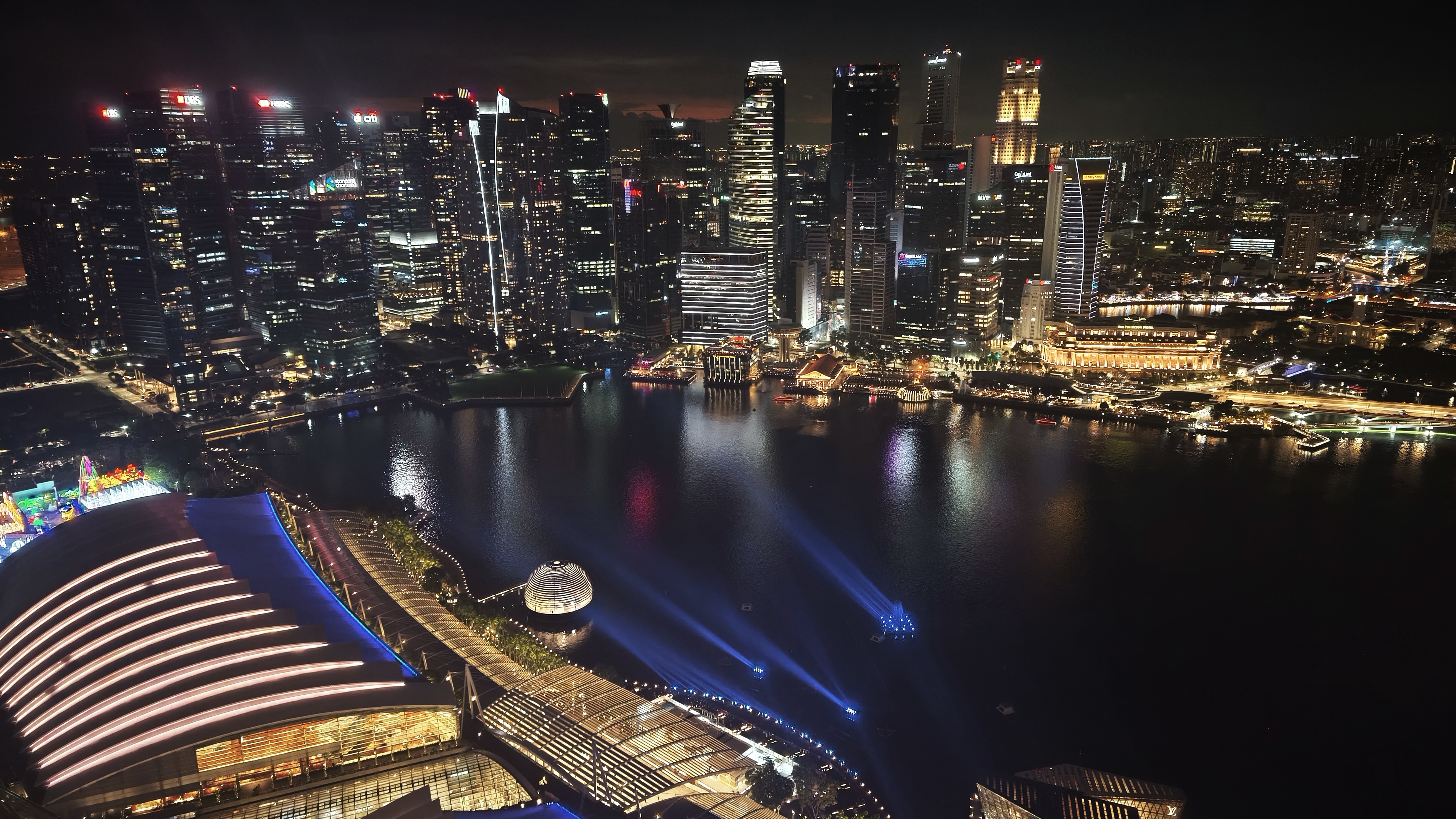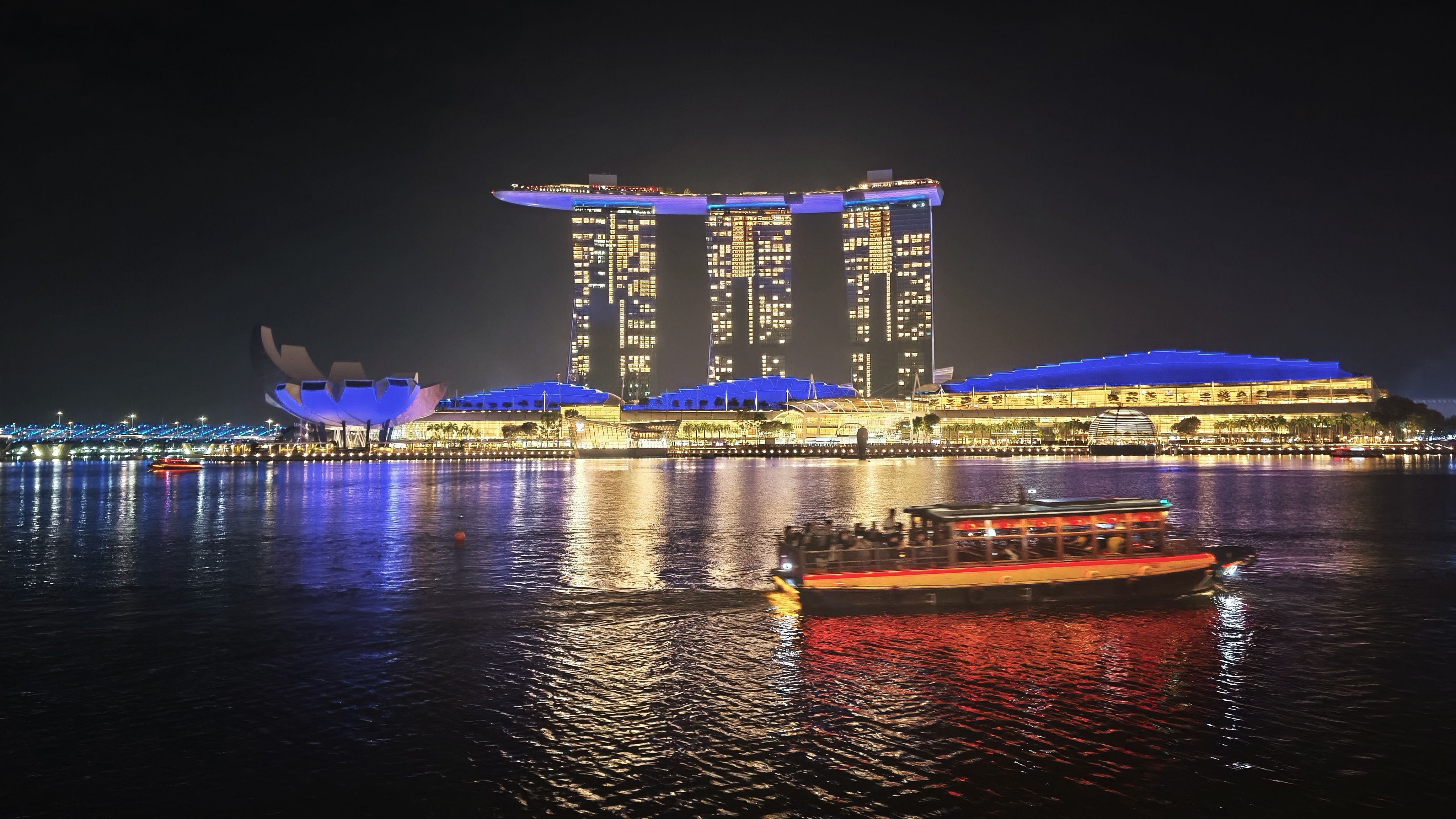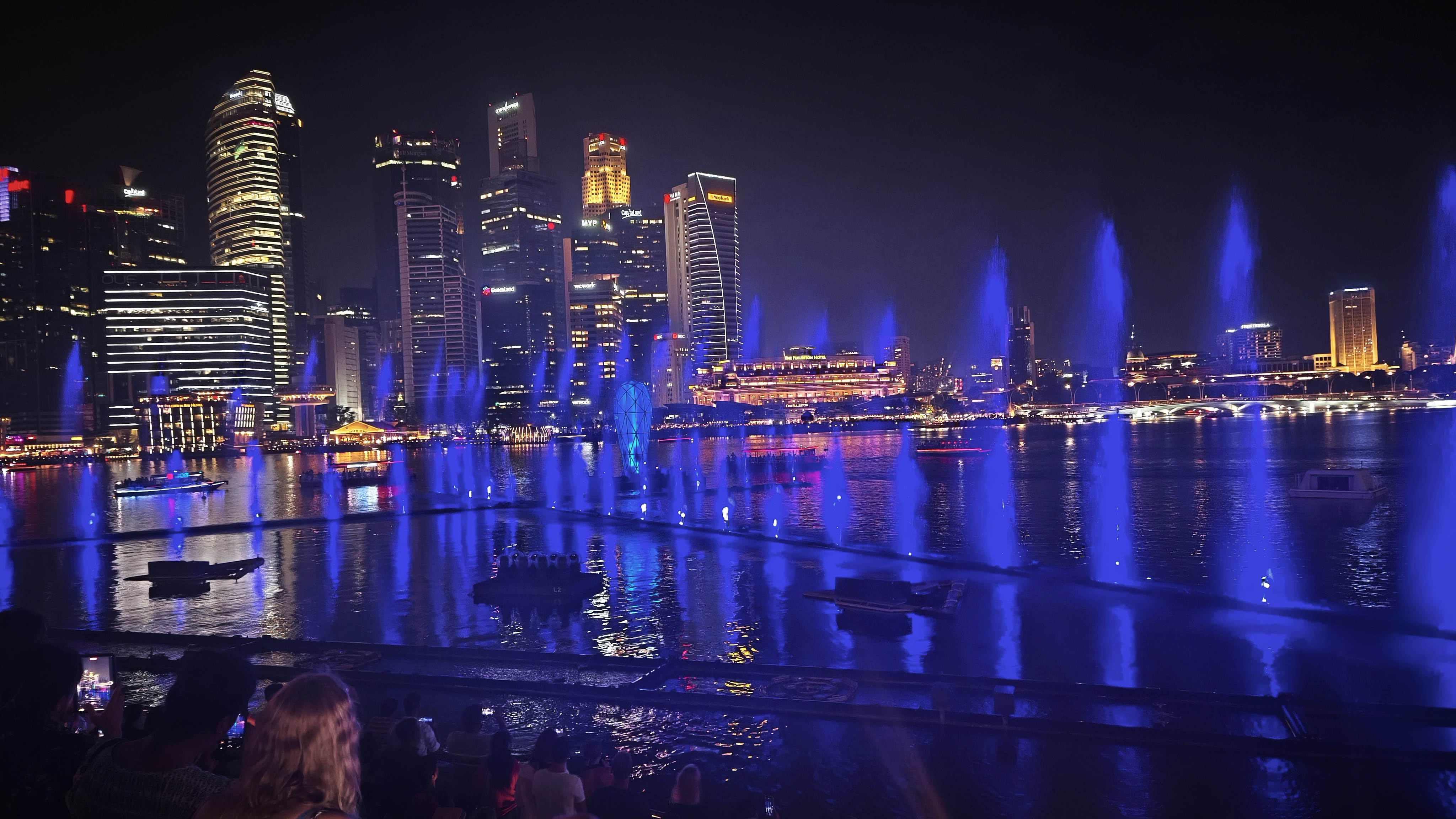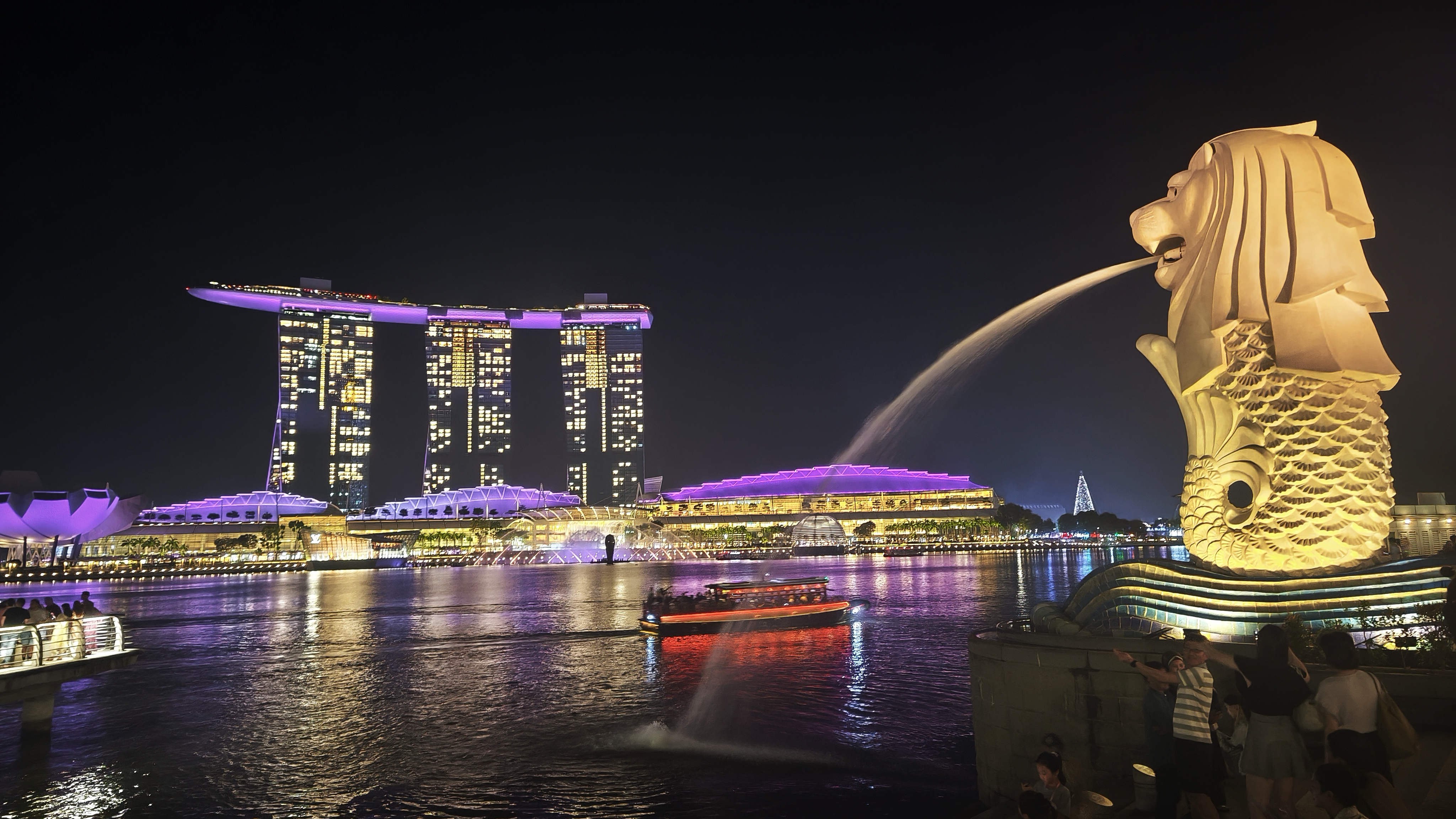 V 19:00 se zřízenci u vstupu do Skyparku chlubím zánovním telefonem, tedy hlavně tím, co je na displeji, jemu to je však v podstatě jedno, stačí ujištění, že máme vstup na 19:00 a vpouští nás dovnitř. Sjedeme jak jinak po jezdících schodech o něco níže, kde už je pikolík, kterého práce evidentně nebaví, ale i tak monotónně snímá QR kódy z papírů a mobilů, aby si potvrdil, že jsou tam lidi s platným vstupem. Pak nás chtějí vyfotit před nějakým záběrem toho přerostlého baráku, což slušně odmítáme, a jdeme do fronty na výtah. Ta není dlouhá a za chvíli fičíme výtahem do 56. patra, kde nás další, jistě akademicky vzdělaný zřízenec, jak ovce vyhání na terasu mezi ostatních asi čtyři sta dalších platících pozorovatelů. Tak se tam pospolu ve 200 metrech nad zemí snažíme dostat k okraji, nasát atmosféru jedné z nejvyšších vyhlídek tohoto typu na světě, a když se to povede, nedochází sice ke slibovanému breathtakingu, dech to prostě nesebere, ale síla to je, zvláště pohled na Garden Bay a na město. Fotíme, kocháme se, koukáme, kde jsme všude byli a čas utíká a než se nadějeme, musíme zase zpět, abychom včas stihli Spectra, tedy světelnou a vodní show doprovázenou hudbou, která se každý pátek a sobotu odehrává před Marina Bay Sands. Trvá přesně 15 minut, a dalších 45 minut pak trvá nám, než obejdeme oblast před Marina Bay Sands kolem vody, abychom dorazili k poslednímu nesplněnému bodu naší návštěvy, k soše Merlion, což je oficiální maskot Singapuru, spojení mořské panny a lva, která měří 8,6 metrů a váží 70 tun a chrlí nepřetržitě vodu. Už značně unaveni fotíme tento skvost a odpadáme na mostě Esplanade a jen se kocháme posledním výhledem na Marina Bay.