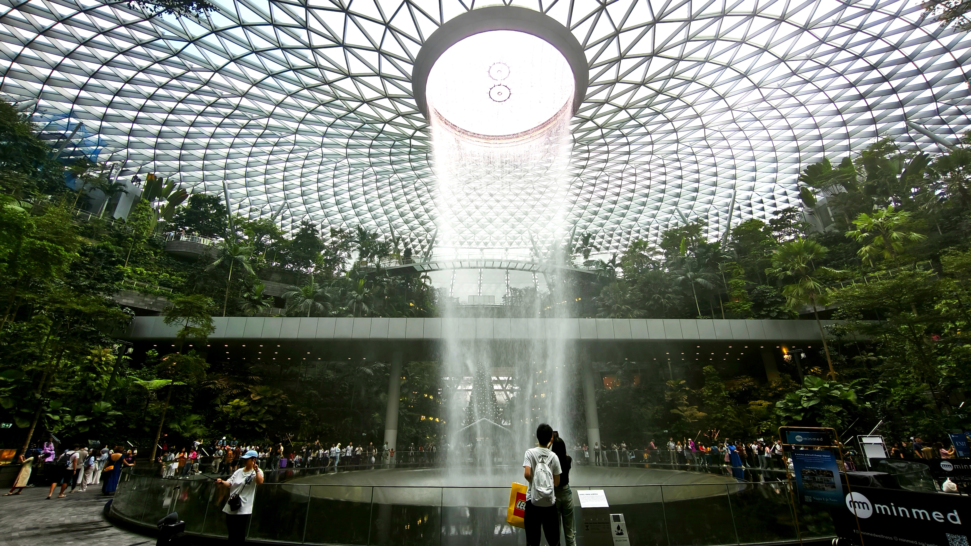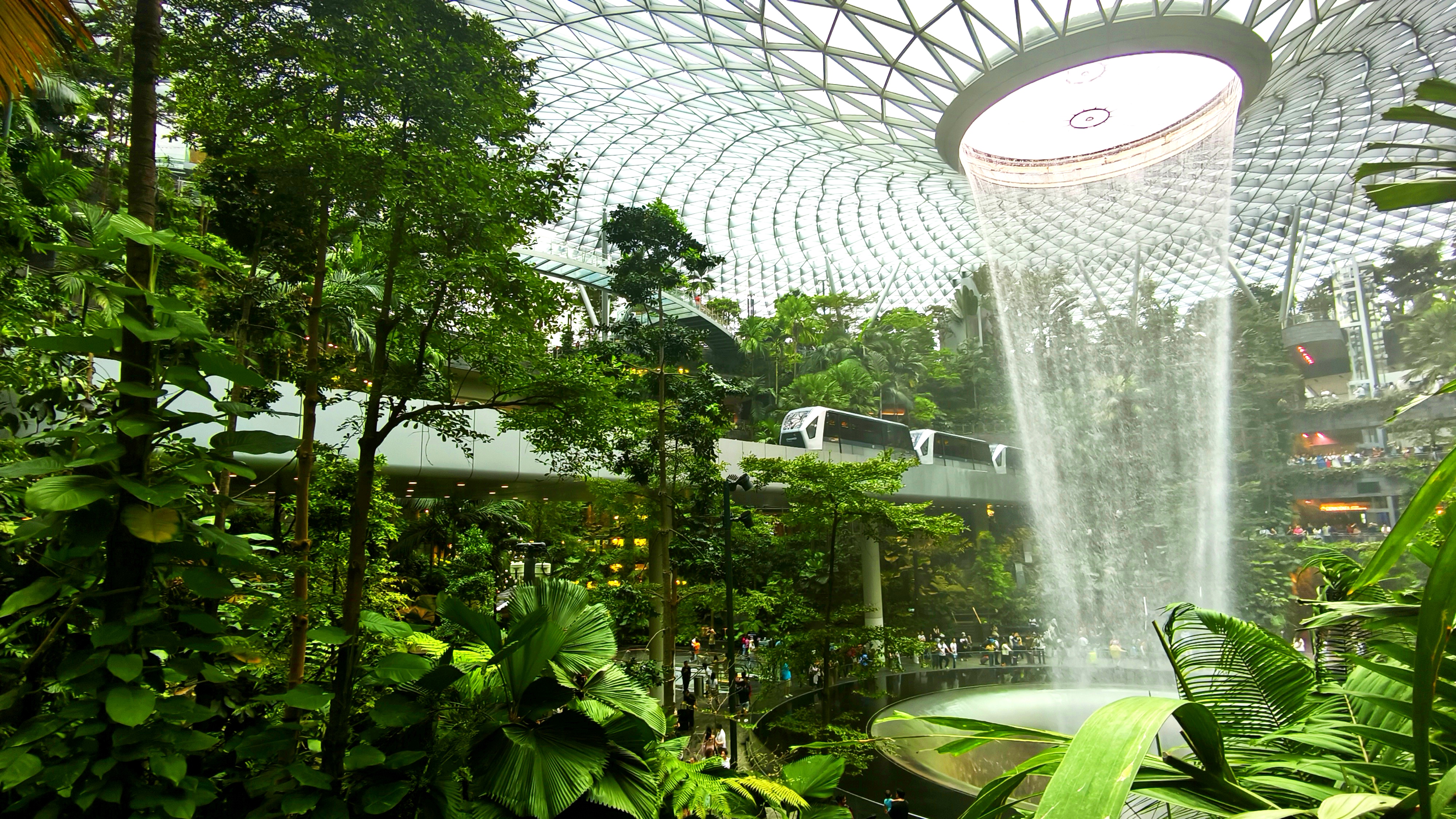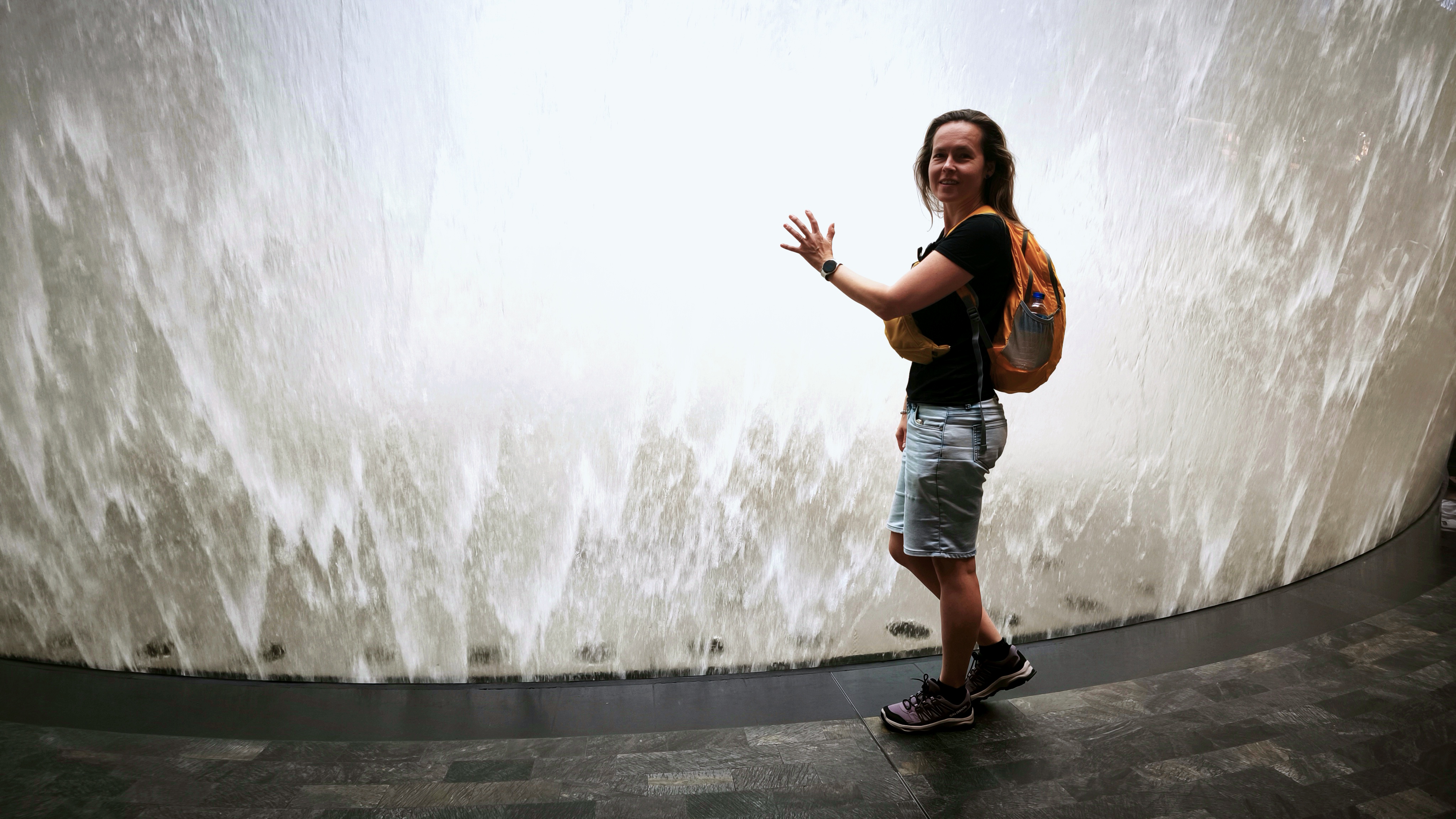 Středobodem letiště Changi je nejvyšší krytý vodopád na světě, Rain Vortex, který je obklopen terasovitým lesním prostředím. Vodopád navštíví 300 tisíc návštěvníků denně. Recirkulující dešťová voda je čerpána na střechu a volným pádem z výšky 40 metrů padá kulatým otvorem rychlostí až 37 850 litrů za minutu do bazénu na úrovni suterénu. Akrylový trychtýř ve spodní části zabraňuje rozstřikování a izoluje zvuk kaskády. A kolem vodopádu ještě projíždí skytrain, spojující terminály. Prošli jsme to od nejvyššího bodu až po suterén a když už nic jiného ze Singapuru, tak toto se fakt musí vidět. K naší smůle jsme tu celou parádu neviděli nasvícenou a ještě bylo pod mrakem, ale ještě se sem při zpáteční cestě vrátíme, tak třeba budeme mít štěstí.