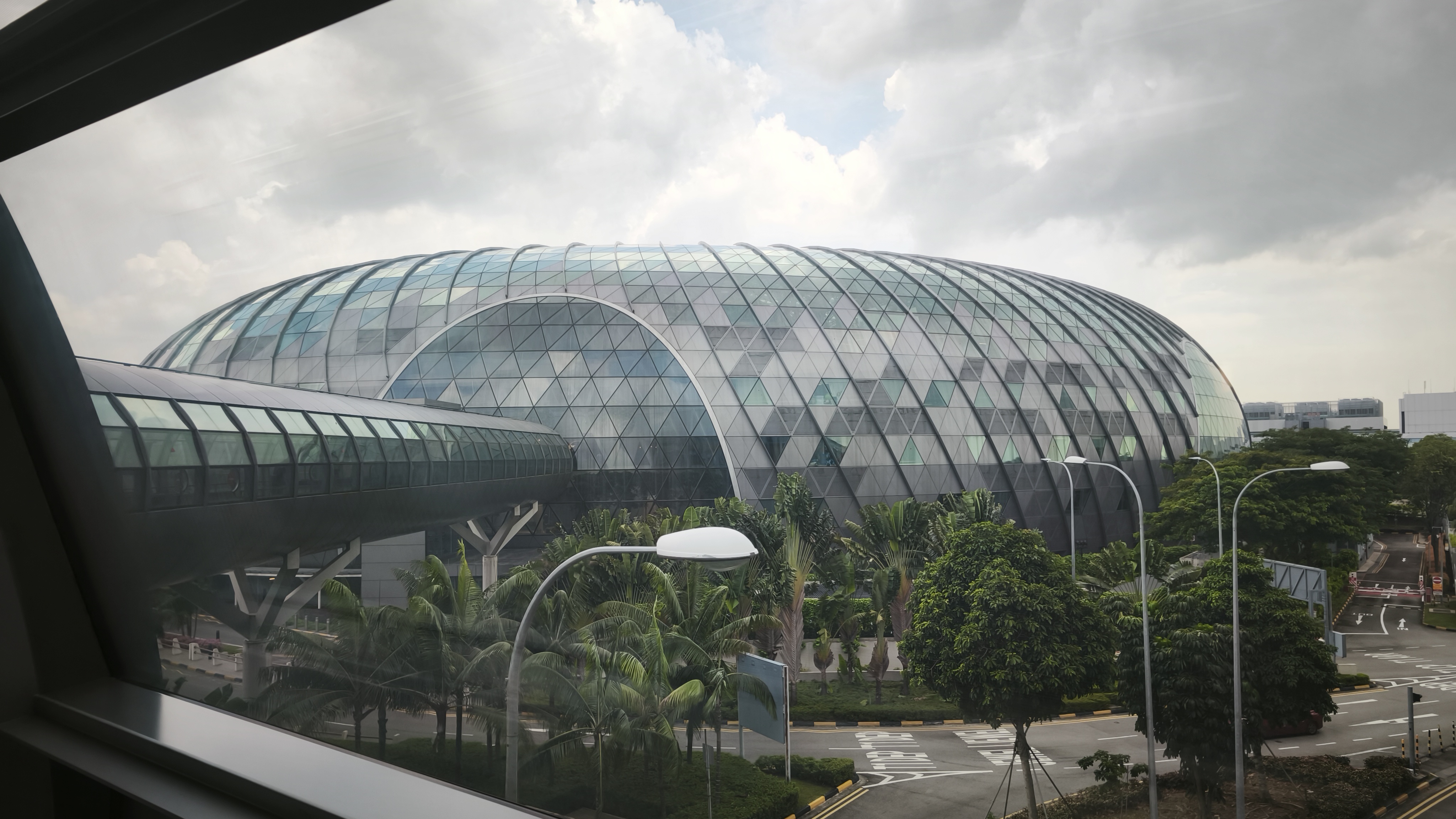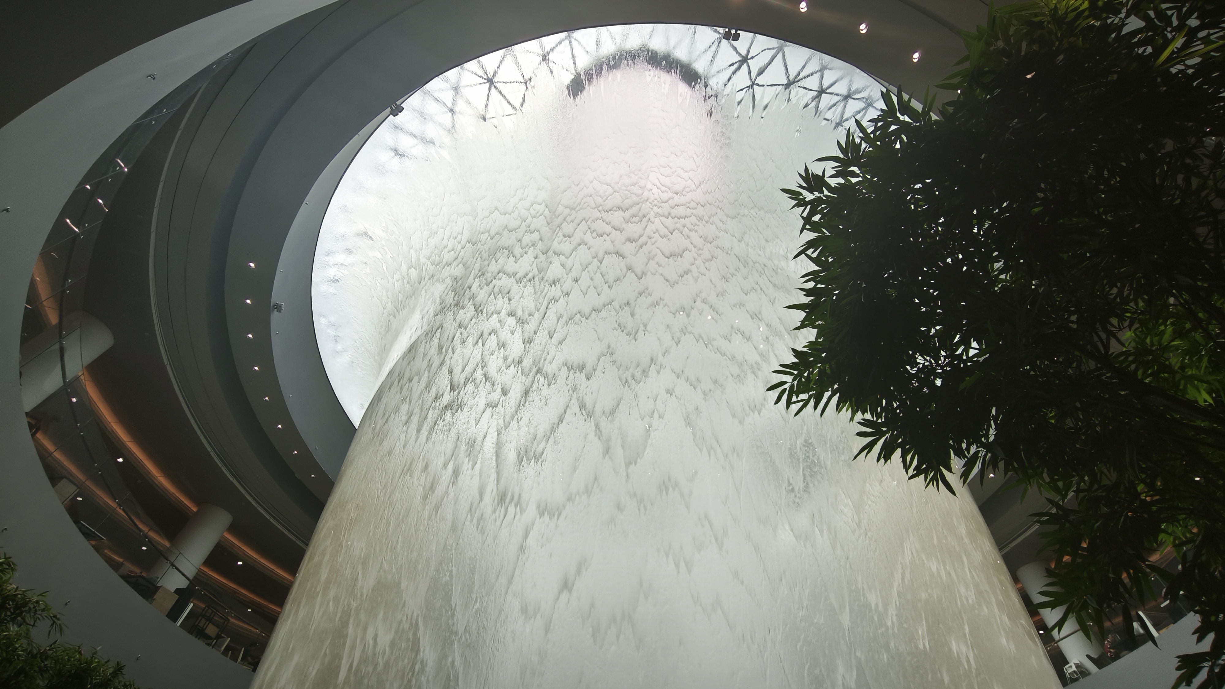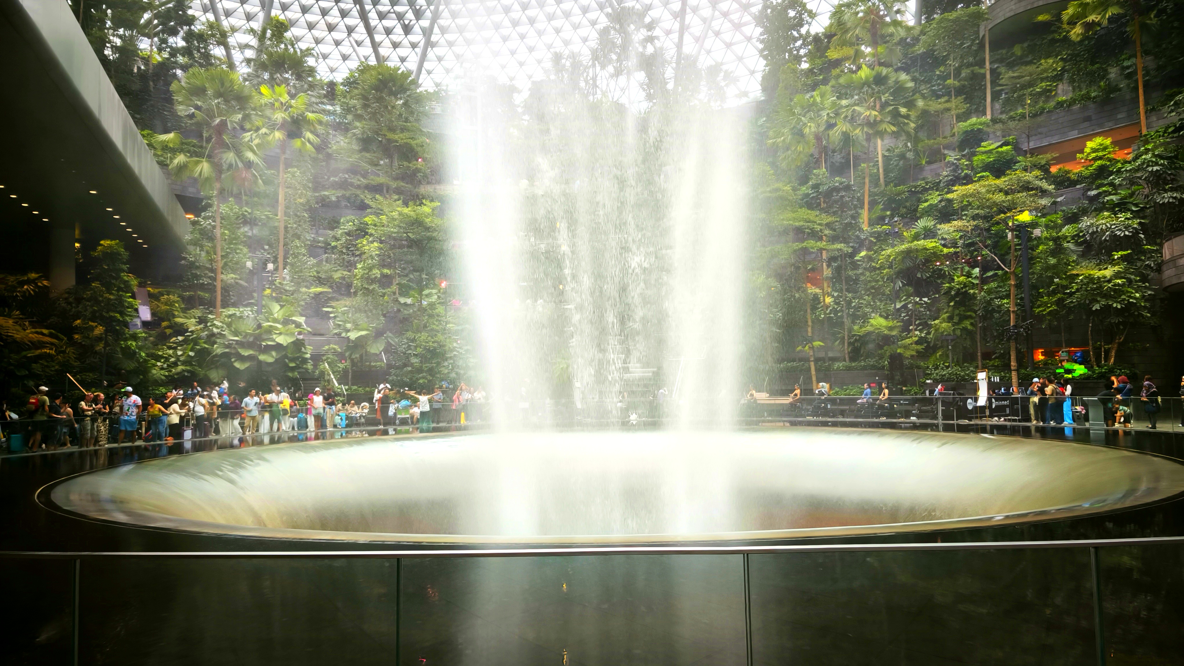 Středobodem letiště Changi je nejvyšší krytý vodopád na světě, Rain Vortex, který je obklopen terasovitým lesním prostředím. Vodopád navštíví 300 tisíc návštěvníků denně. Recirkulující dešťová voda je čerpána na střechu a volným pádem z výšky 40 metrů padá kulatým otvorem rychlostí až 37 850 litrů za minutu do bazénu na úrovni suterénu. Akrylový trychtýř ve spodní části zabraňuje rozstřikování a izoluje zvuk kaskády. A kolem vodopádu ještě projíždí skytrain, spojující terminály. Prošli jsme to od nejvyššího bodu až po suterén a když už nic jiného ze Singapuru, tak toto se fakt musí vidět. K naší smůle jsme tu celou parádu neviděli nasvícenou a ještě bylo pod mrakem, ale ještě se sem při zpáteční cestě vrátíme, tak třeba budeme mít štěstí.