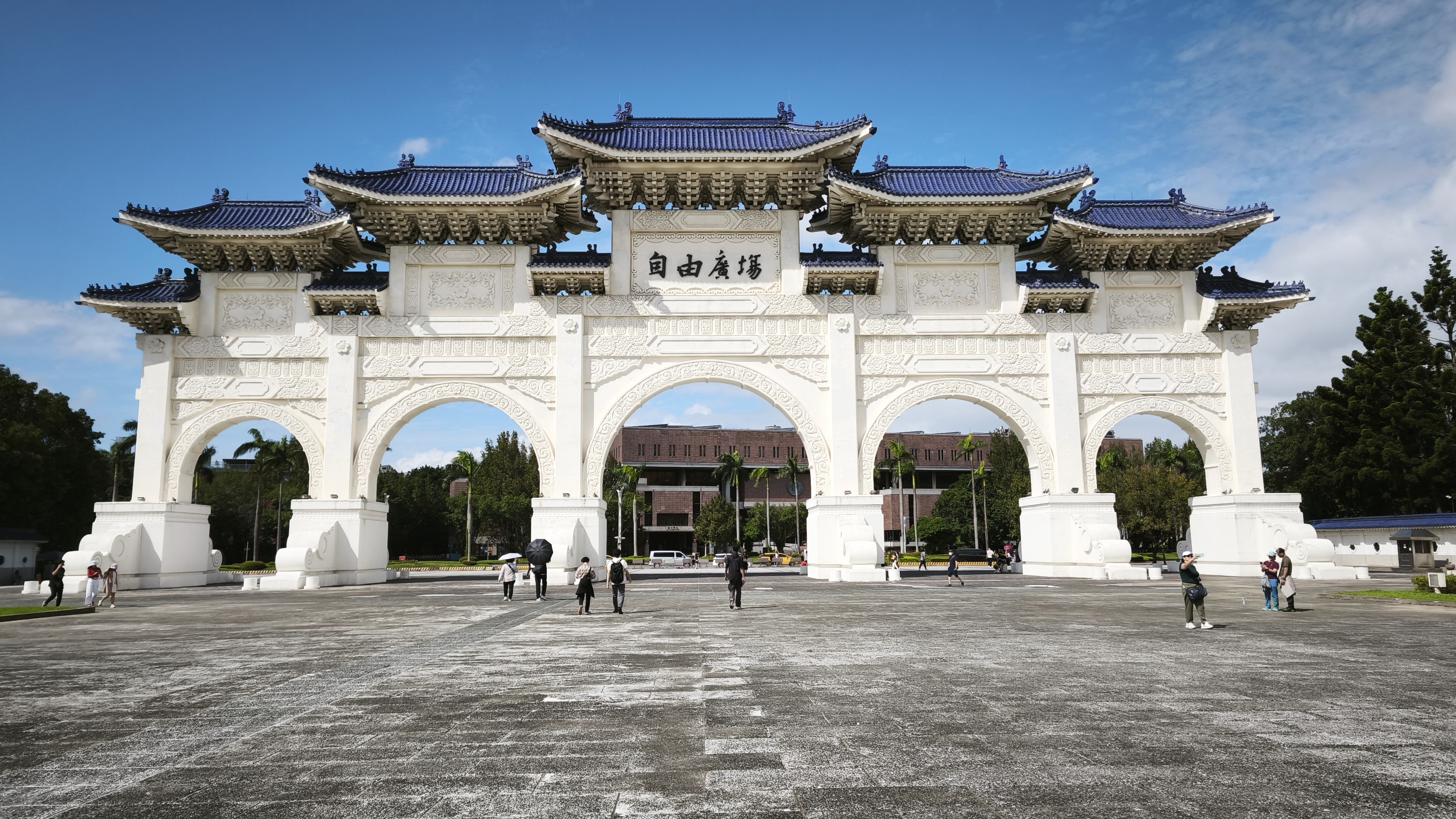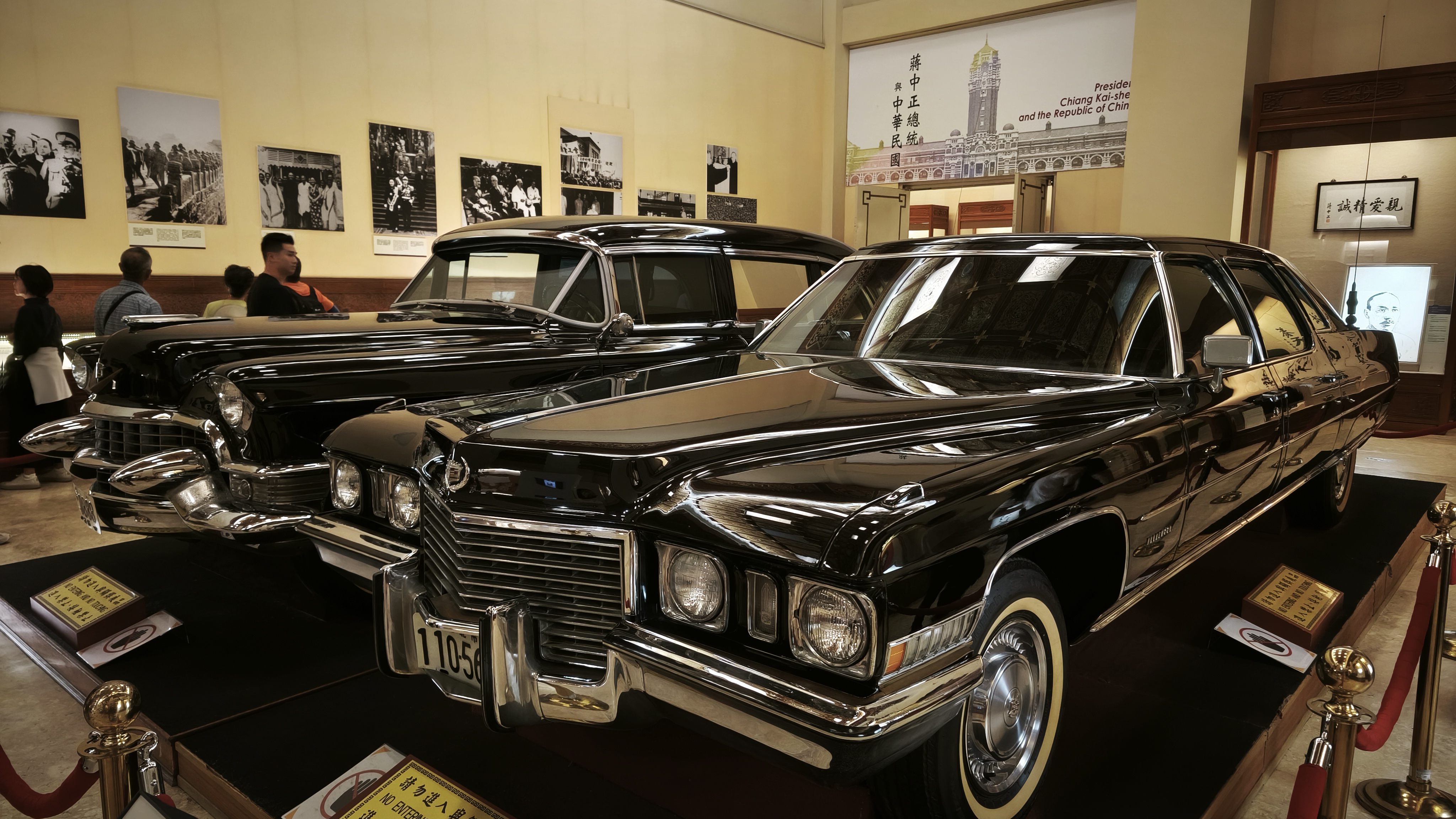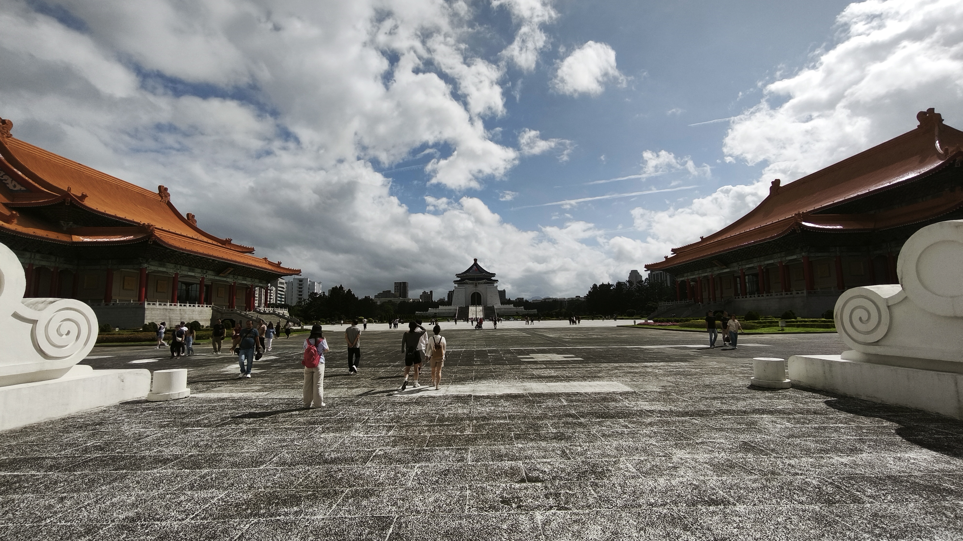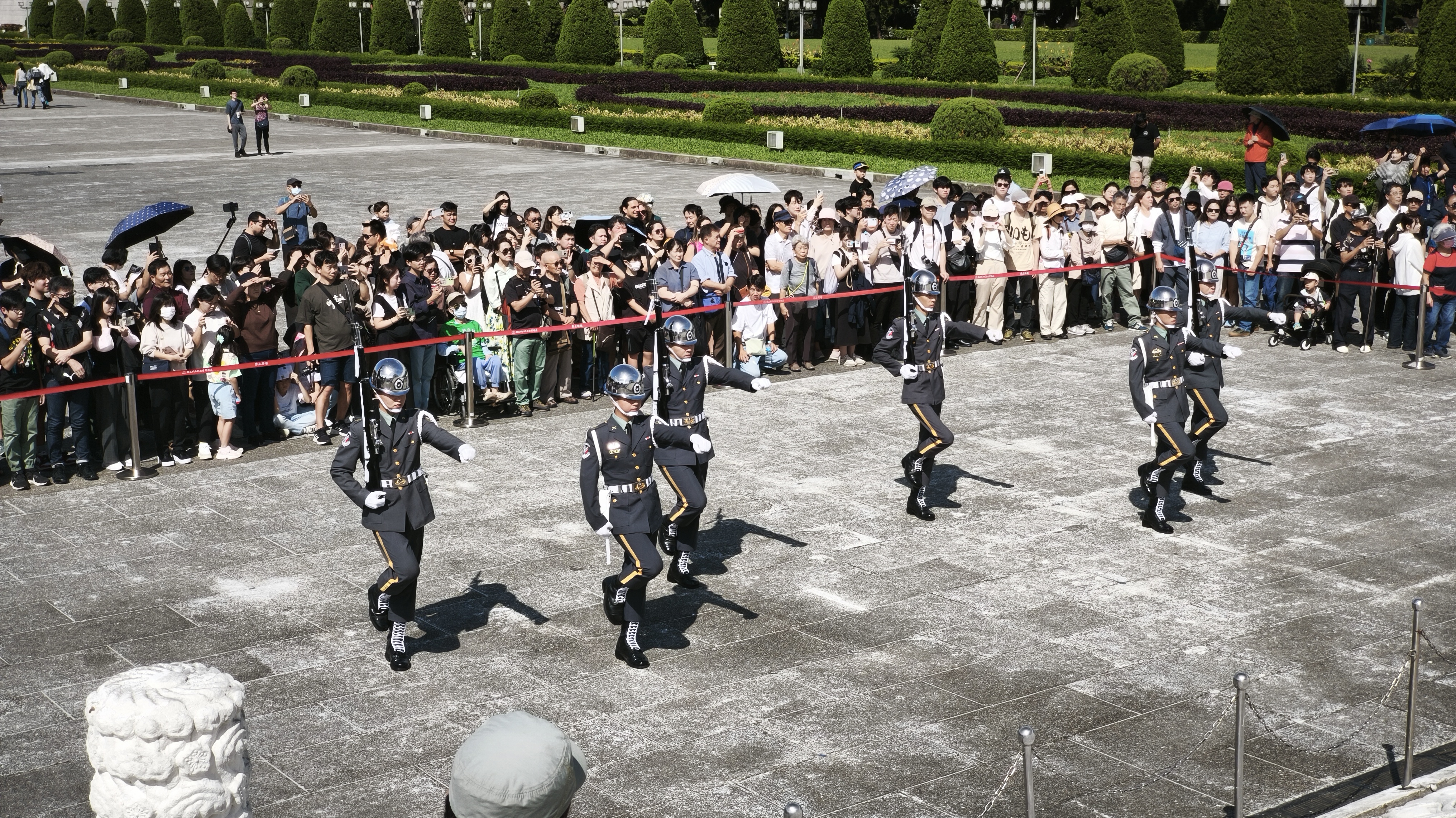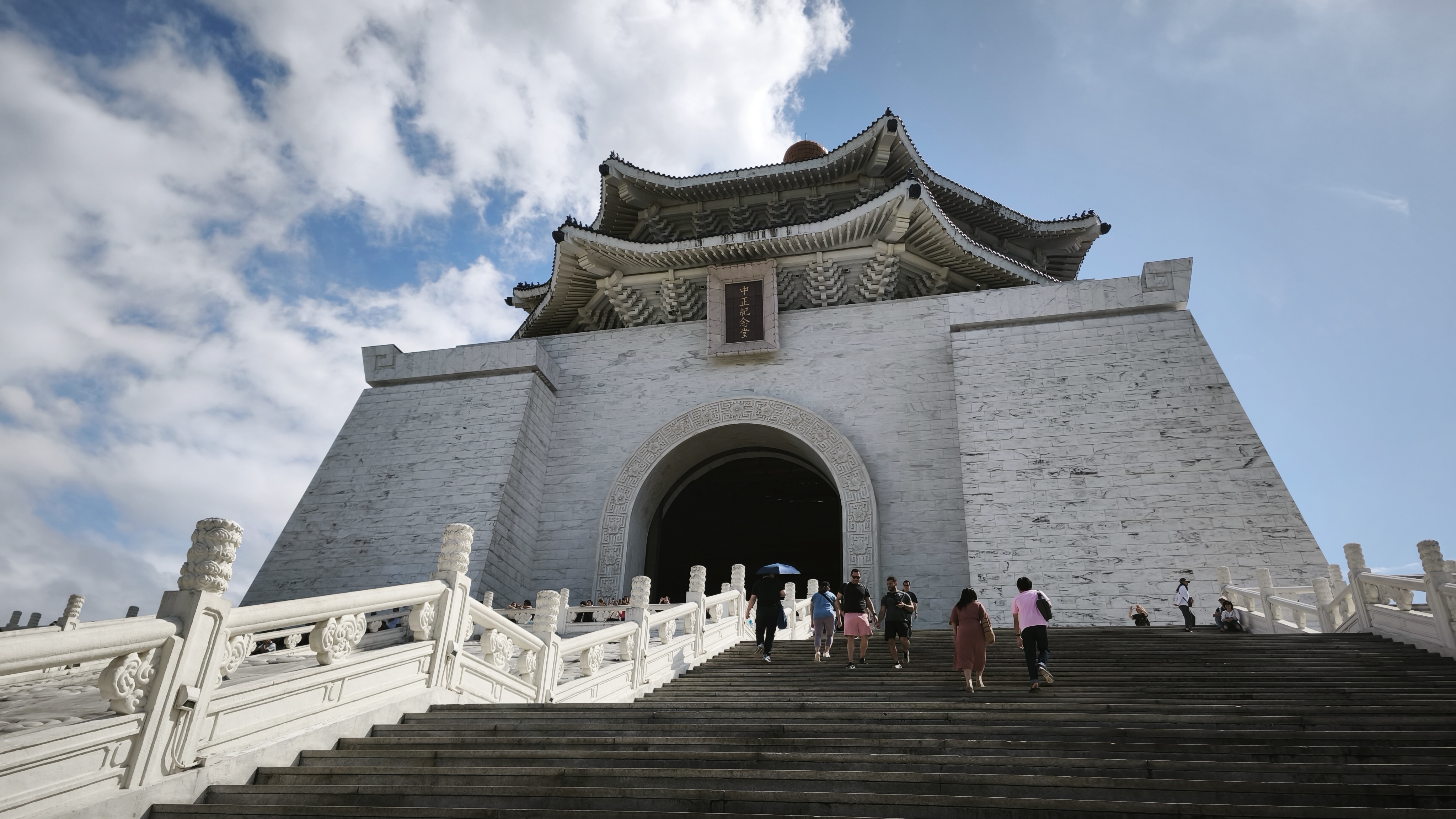 Svítí slunce, 24 stupňů a tak se snažíme přes boční uličky ve stínu dojít k pomníku. Když se před námi najednou objeví, je nám jasné, že se již před sluncem neschováme. Památník je prostě obrovský, je obklopený rozsáhlým parkem, boční brány majestátné, a ta největší na konci parku je naprosto gigantická. Za hlavní branou jsou dvě obrovské tradiční budovy, Národní divadlo a Národní koncertní síň. Pak dlouho nic a nakonec již zmíněný památník, na jehož vrchol vede nepočítaně schodů, po jejichž zdolání vejdete do obrovské síně, ve které je až zrůdně obrovská bronzová socha sedícího bývalého prezidenta Číny, Chainga Kai-sheka. Tento prezident byl u moci nepřetržitě v letech 1938-1975 a jeho příběh i historie stojí za prozkoumání. Byl to představitel té Číny, tedy přesně dodnes existující strany Kuomintang, nebo také Čínské nacionalistické strany, proti které se dnes Taiwan staví a nechce ji být ovládnutý, ale ono je to všechno trochu jinak. Dnes právě tato strana na Taiwanu vyhrává volby a vládne, s Čínou jsou v podstatě za dobře a pokouší se pomalými kroky s Čínou sblížit, což se pomalu a jistě daří. Nakonec do této země nás dopravil Čínský národní dopravce. Pod síní s bronzovou sochou prezidenta je pak několik pater, ve kterých je zachycen jeho život a činy, jsou tu artefakty z jeho života, včetně dvou na zakázku vyrobených prezidentských vozů značky Cadillac, a také část věnovaná právě demokracii a změnám na Taiwanu. Ta jediná nebyla opatřena anglickými popisky, ale s google překladačem to nebyl tak velký problém a člověk se leccos dozvěděl. Věnujeme celému památníku tolik času, kolik si z pohledu naší znalosti a potřeby zaslouží, a když památník opouštíme, ještě stačíme zhlédnout prezentaci místní stráže, která probíhá každou hodinu (pochodují, blbnou s puškami a tváří se u toho strašně důležitě).