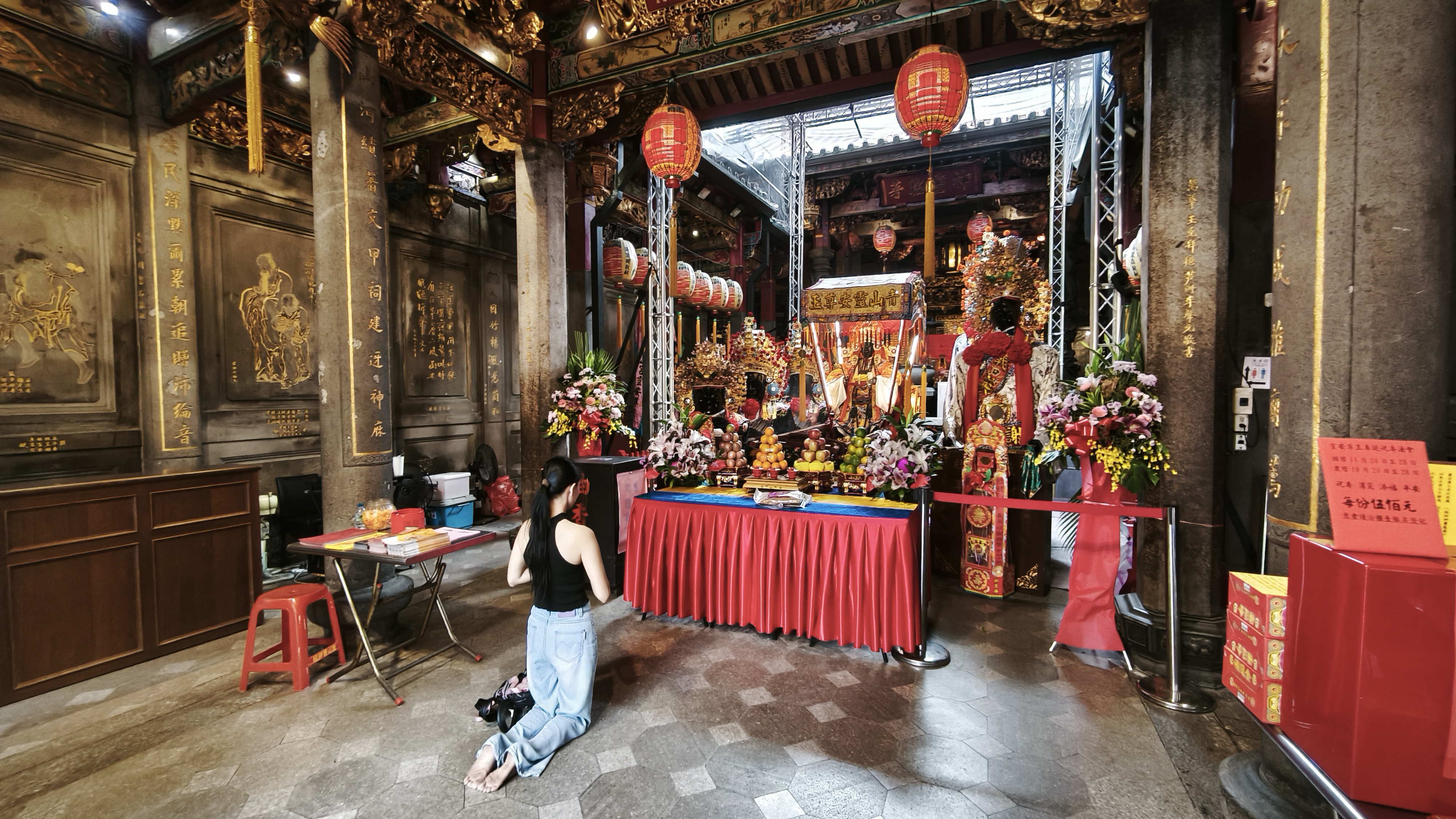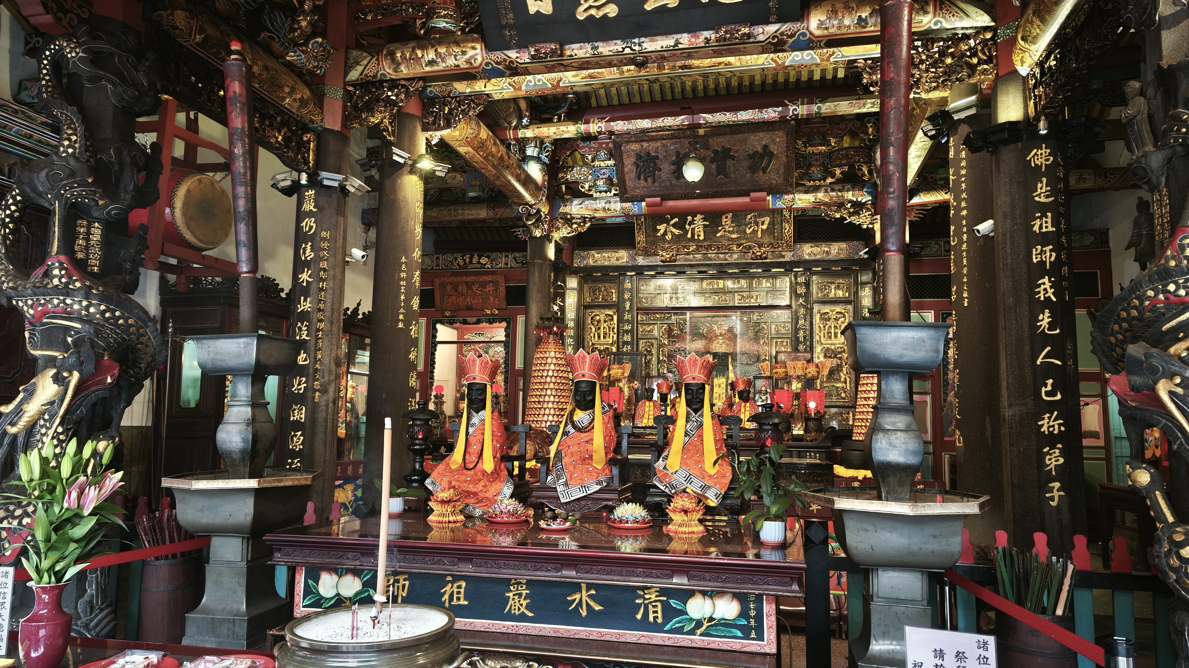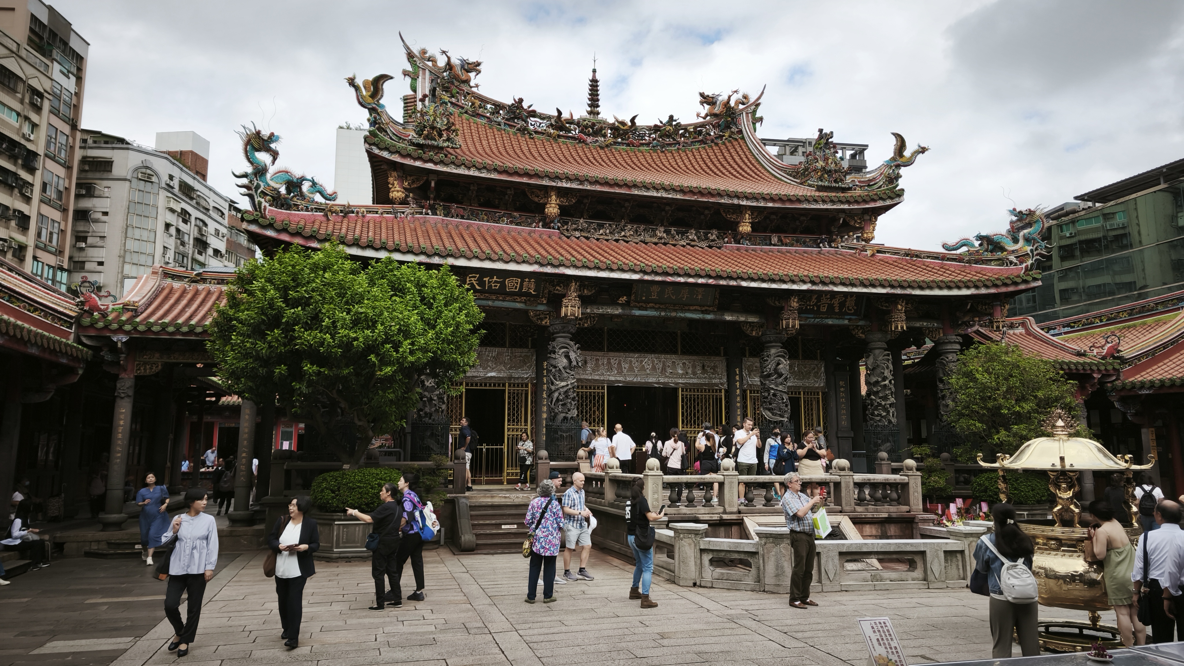 Počasí pořád nic moc, ale spíše mrholilo než pršelo, tak že to bylo vlastně v těch 24 stupních příjemné, a tak jsme prozkoumali okolí půjčovny a vytyčili tři cíle. Prvním byl, jak taky jinak tady, chrám Xianse, který vznikl v roce 1751 v době působení dynastie Qing. Přes různé přestavby a úpravy byl nakonec v roce 1984 přestavěn do původní podoby. Architektura je směsí tradičních čínských stylů, obsahuje složité řezby, barevné nástěnné malby a zdobené střešní dekorace v podobě různých výjevů z historie, prezentovaných malými vyřezávanými postavičkami. Co je hodně zajímavé, je to, že se nachází na území Nové Tchaj-peje, tedy části Tchaj-peje, která se staví zcela znovu a je tak doslova obklopen moderní architekturou vysokých věžáků, hotových nebo rozestavěných. V tuto chvíli to byl ten nejhezčí chrám, který jsme navštívili. To jsme ještě netušili, co přijde.
